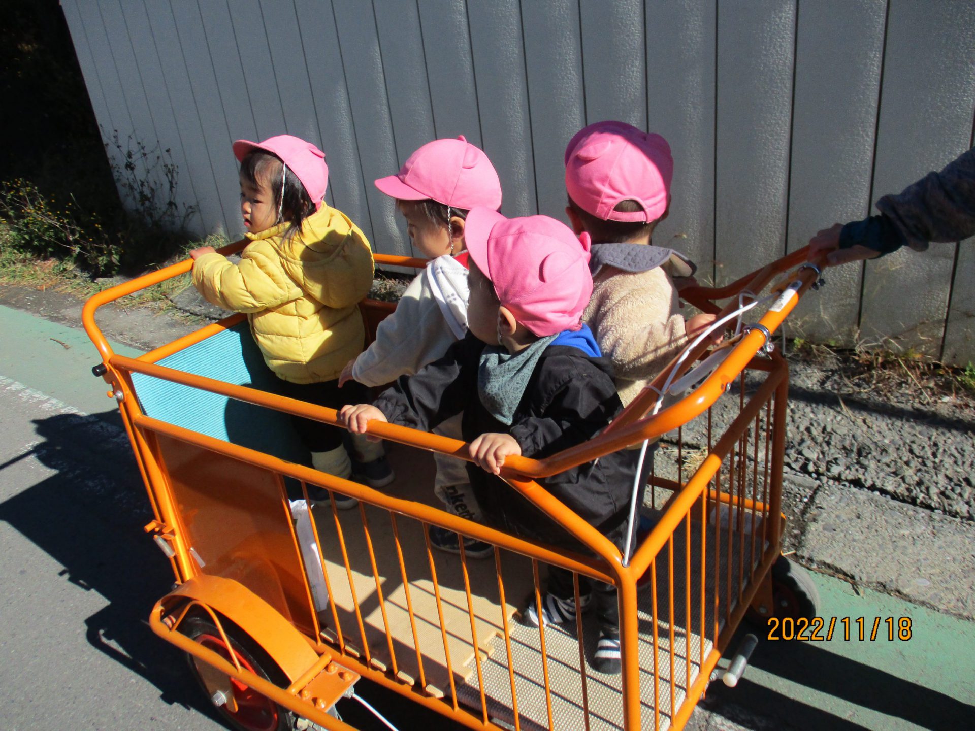 今日はどんぐり探しや土手のぼりに挑戦しよう!ということでみんなでバギーの乗って出発!!