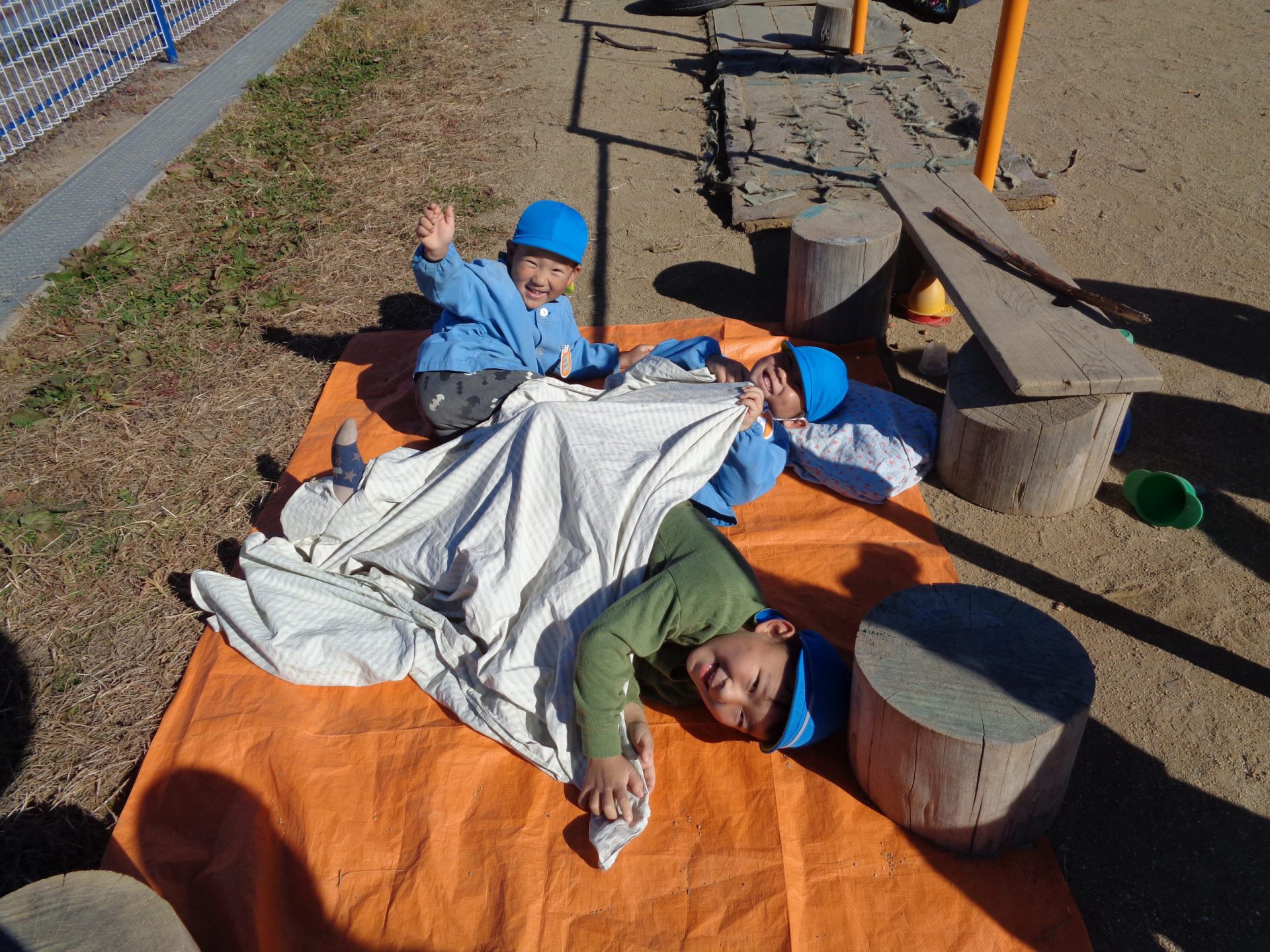 おひさまポカポカの小春日和におうちごっこ。シートを敷いてお布団をかけて…
