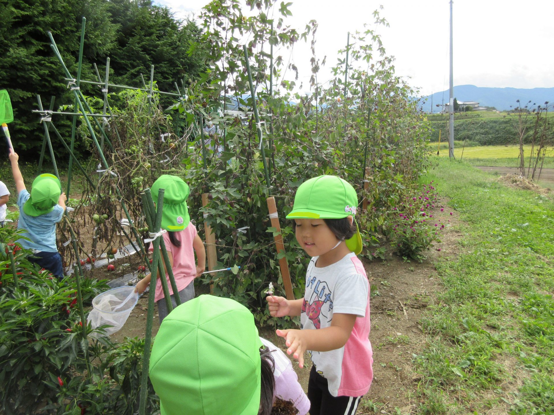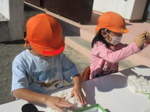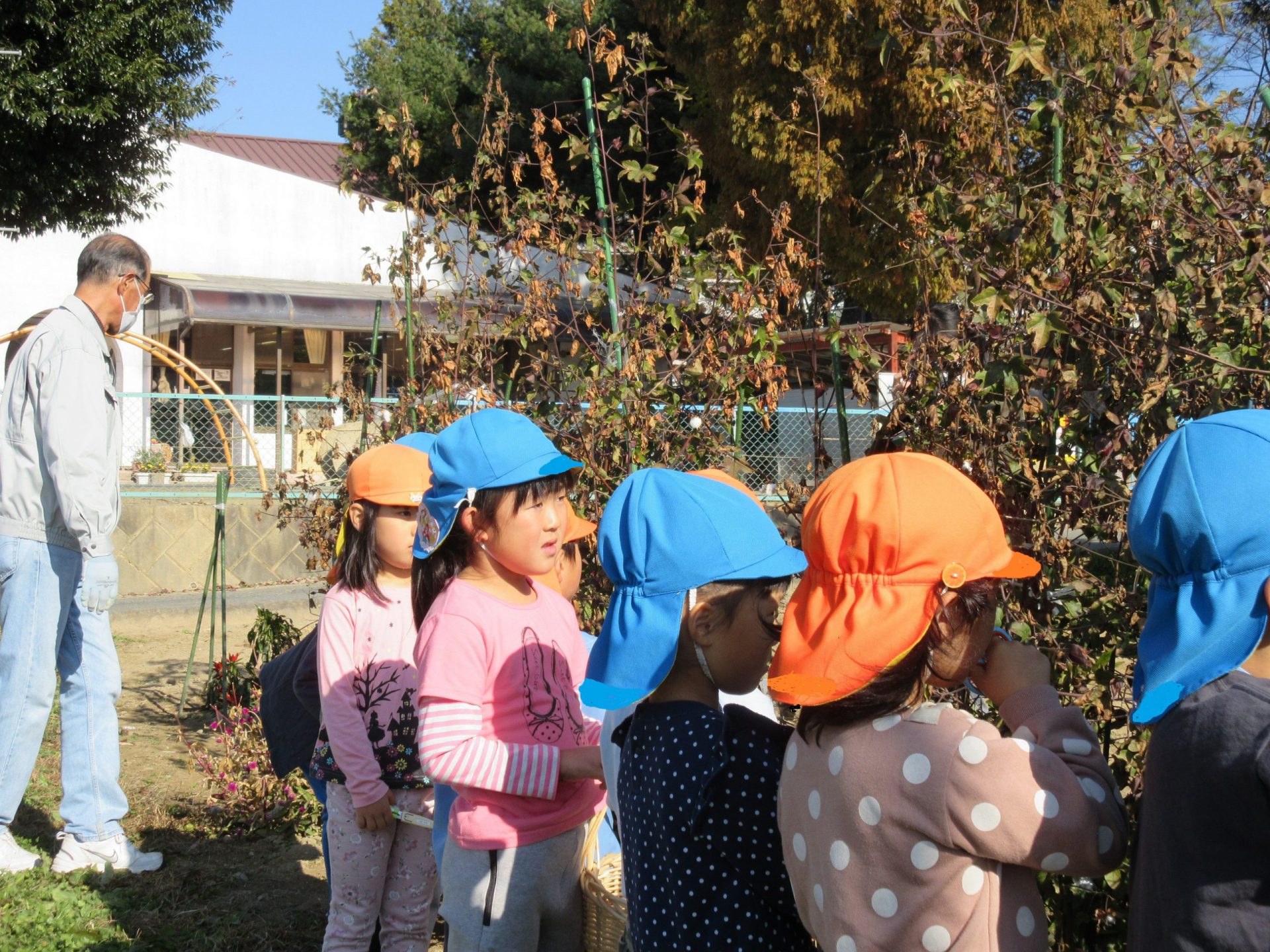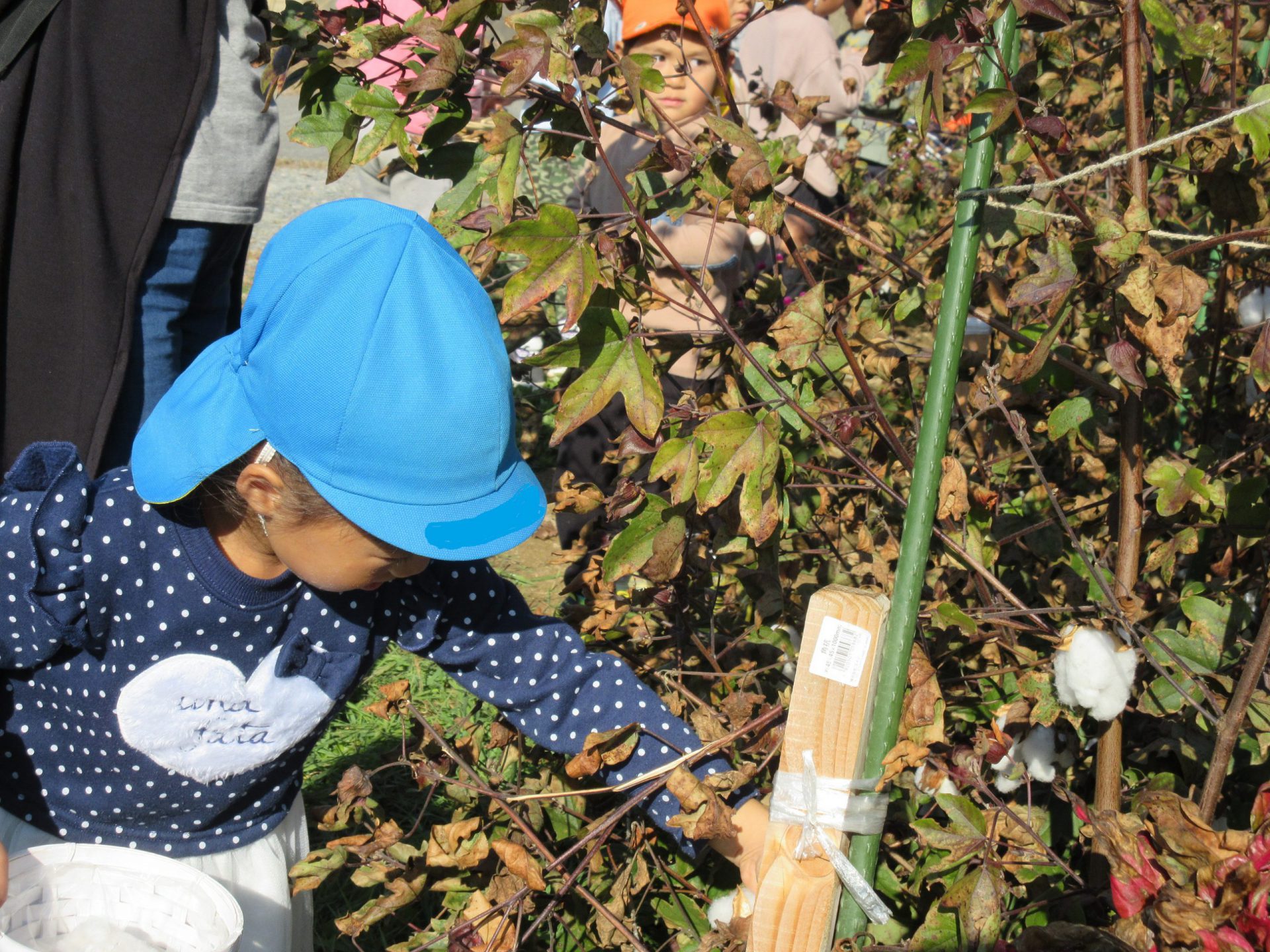 年長さんは昨年の経験から綿の成長は知っていたつもりでしたが、収穫の仕方など改めて地域の方に教えていただき、新たな発見ができました。なかなか触れる機会が少ない綿ですが、地域の方の協力もあり、身近に成長の様子を見たり、触れたりでき、関心も高まっています。