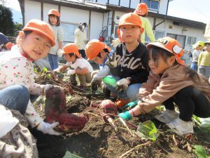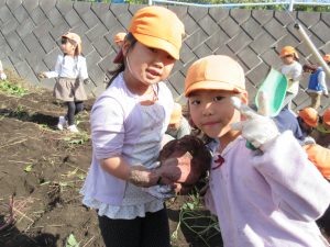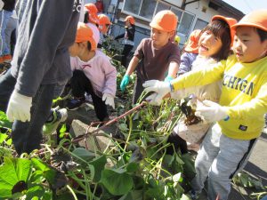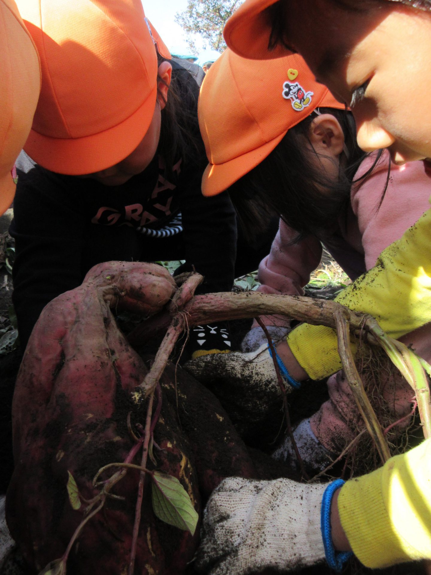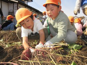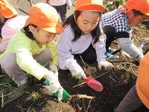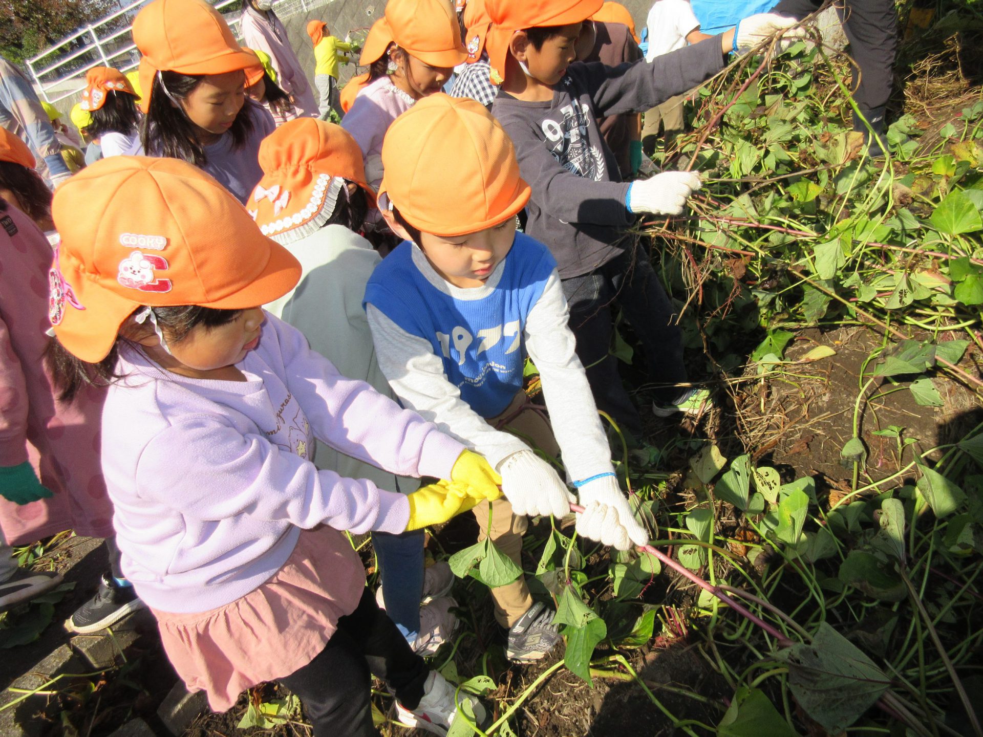 秋晴れの空の下、年長さくら組みんなで、さつまいも掘りをしました。