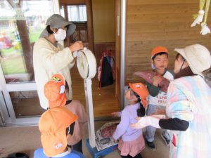 「こっちの方が大きいと思う」「こっちは丸くて大きい!」形比べで盛り上がり、次は体重計にのせて、重さ№1!を見つけることになりました。