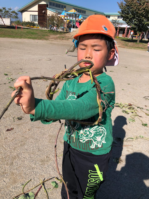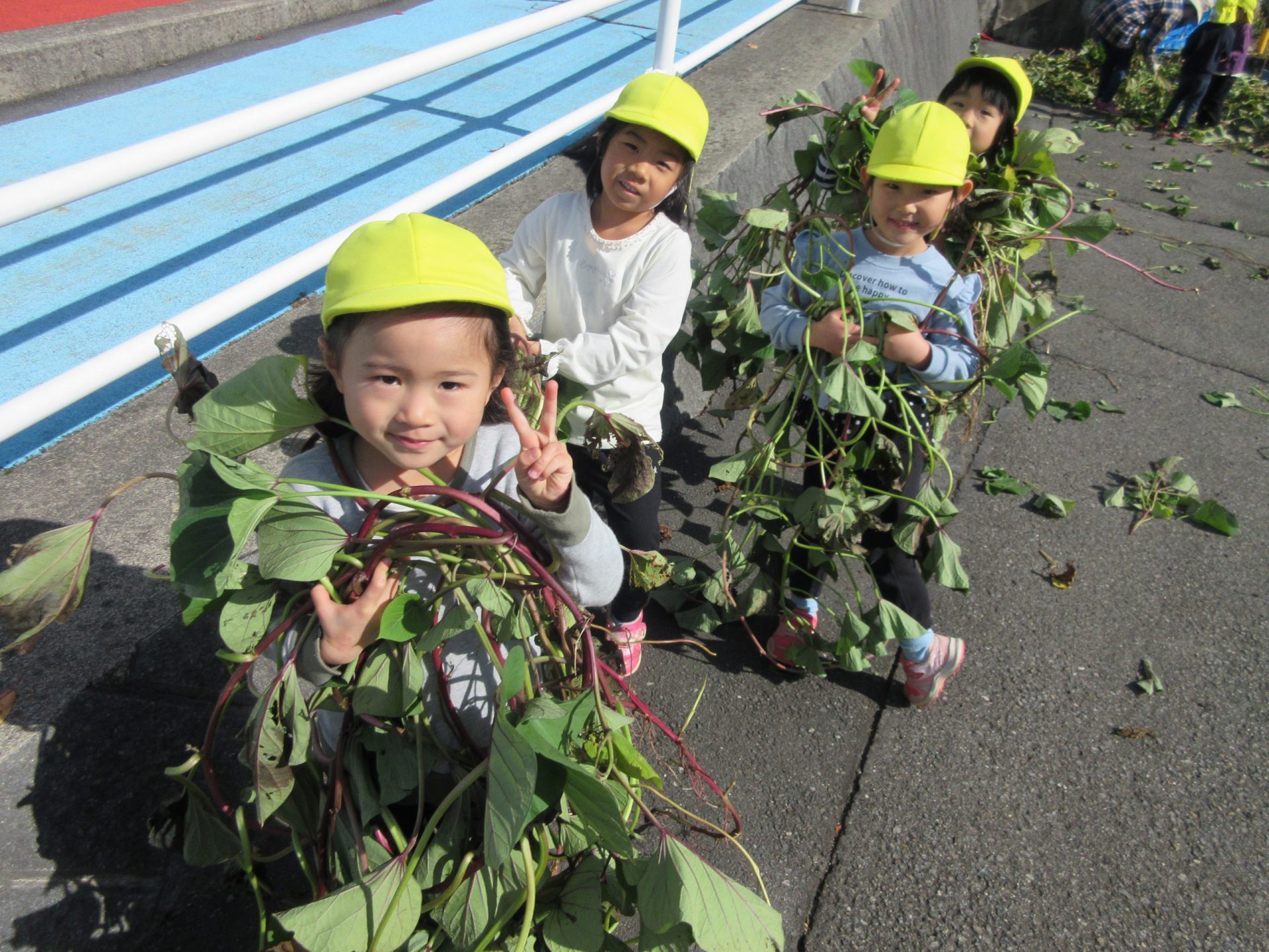 たーくさんっ!!!さつまいものツルを抱えたぶどう組さんが、保育園まで運んでいきます。