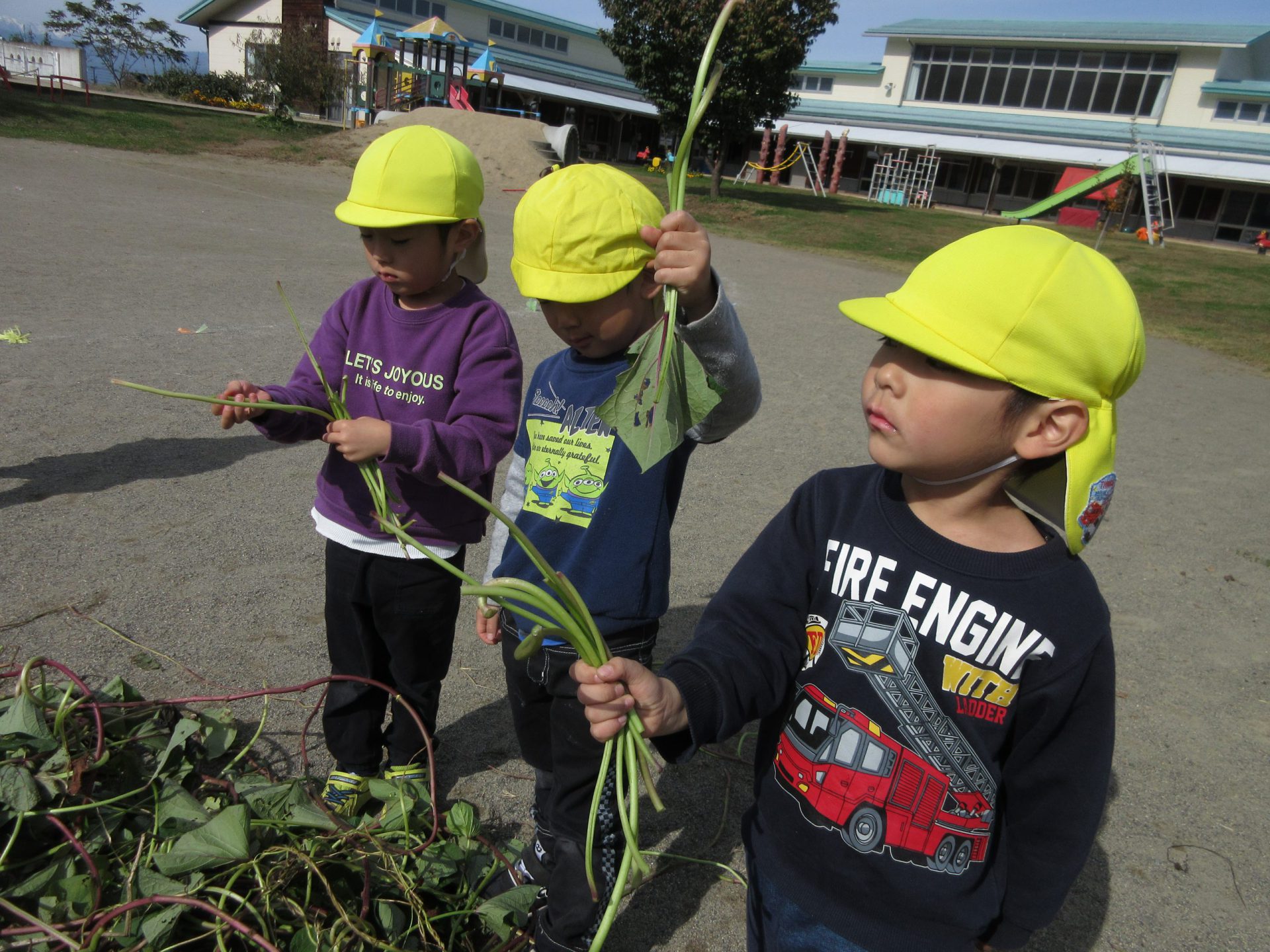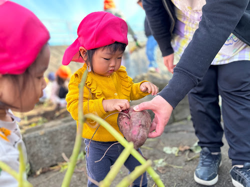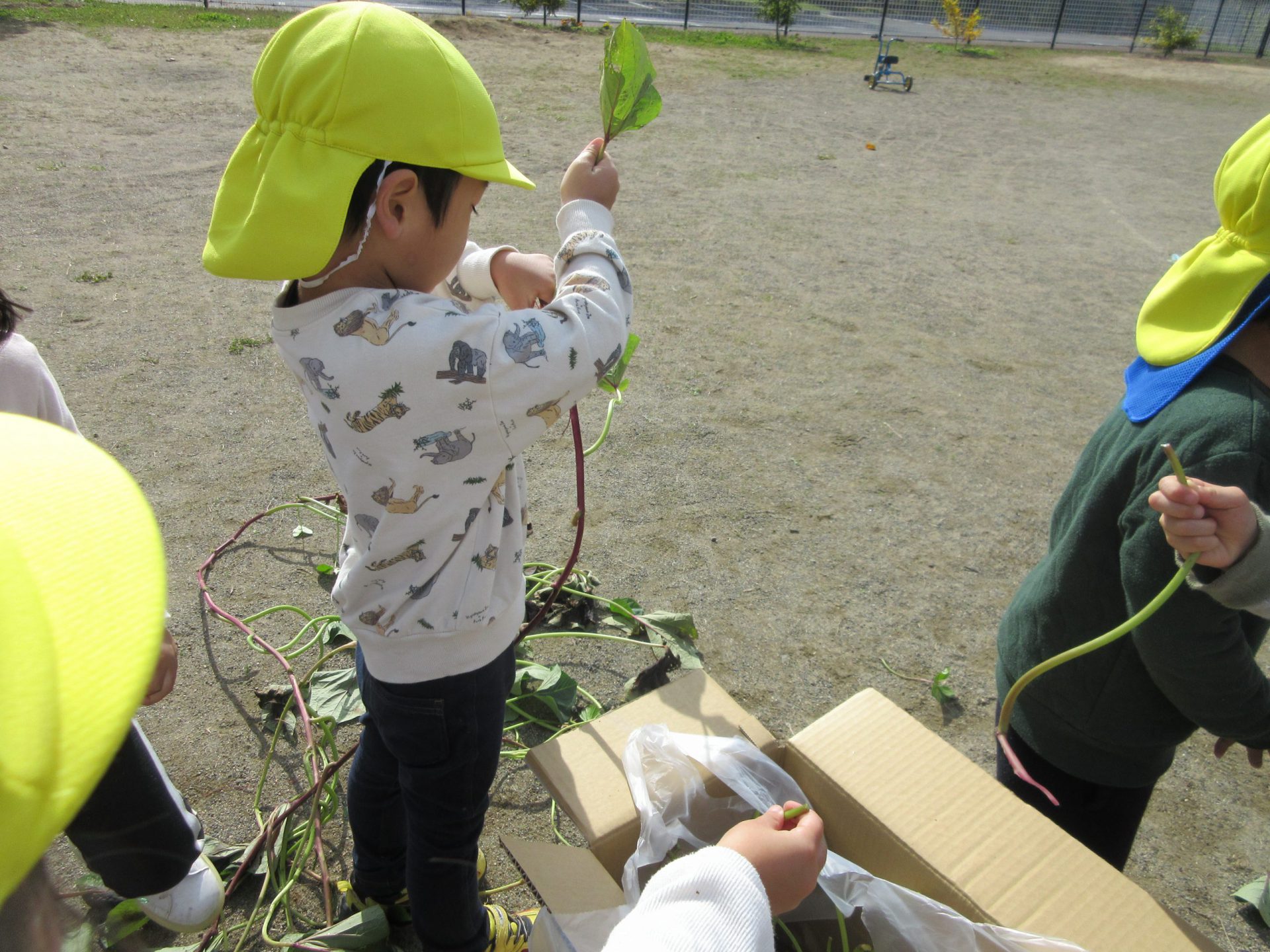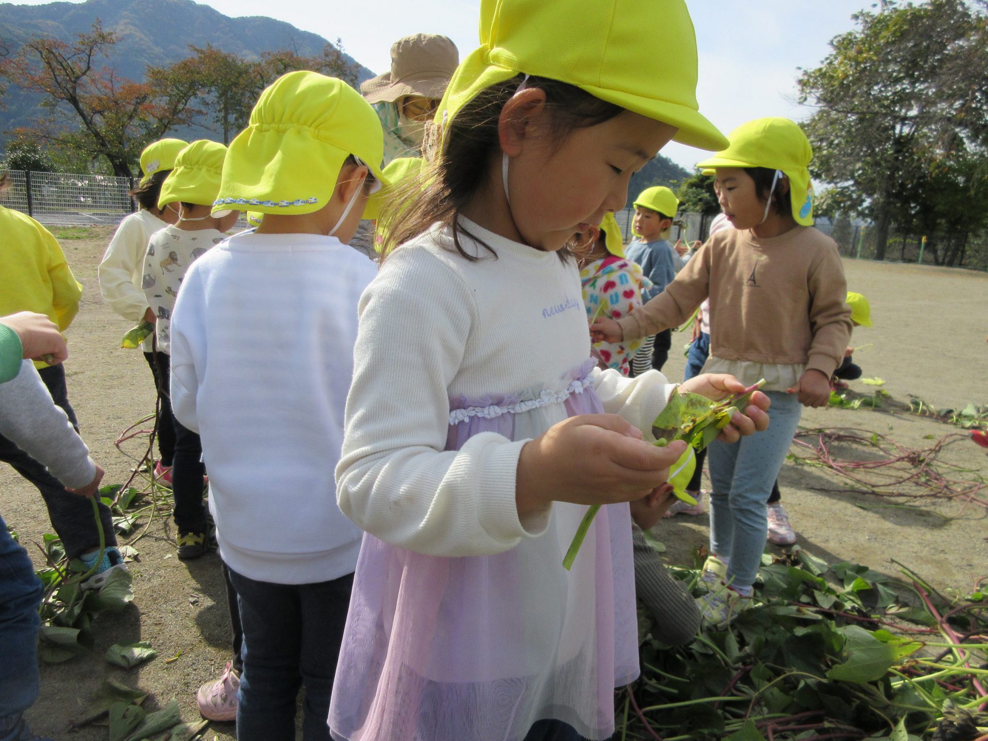 「見て見て!さつまいもだよ」先生の言葉に、恐る恐る手を伸ばして触れてみます。