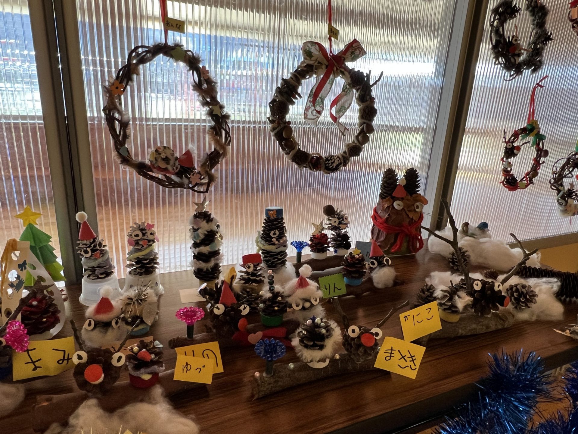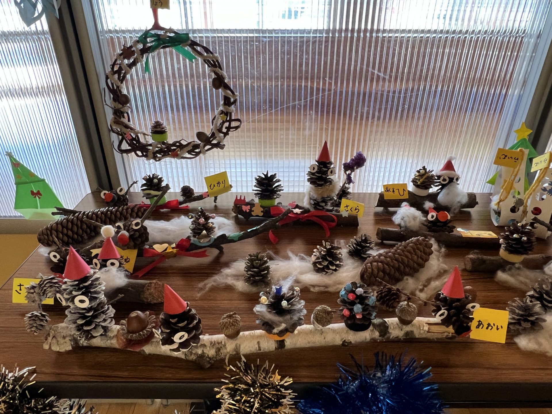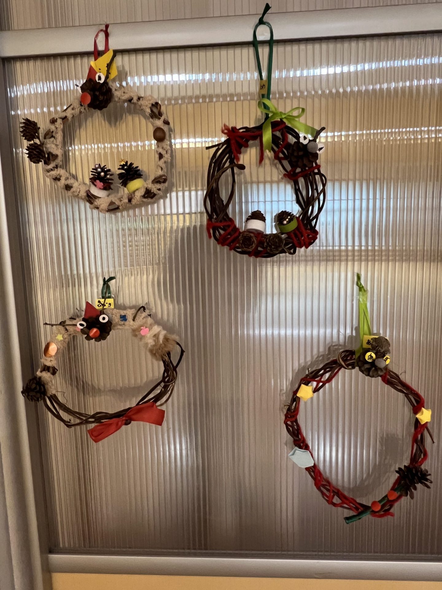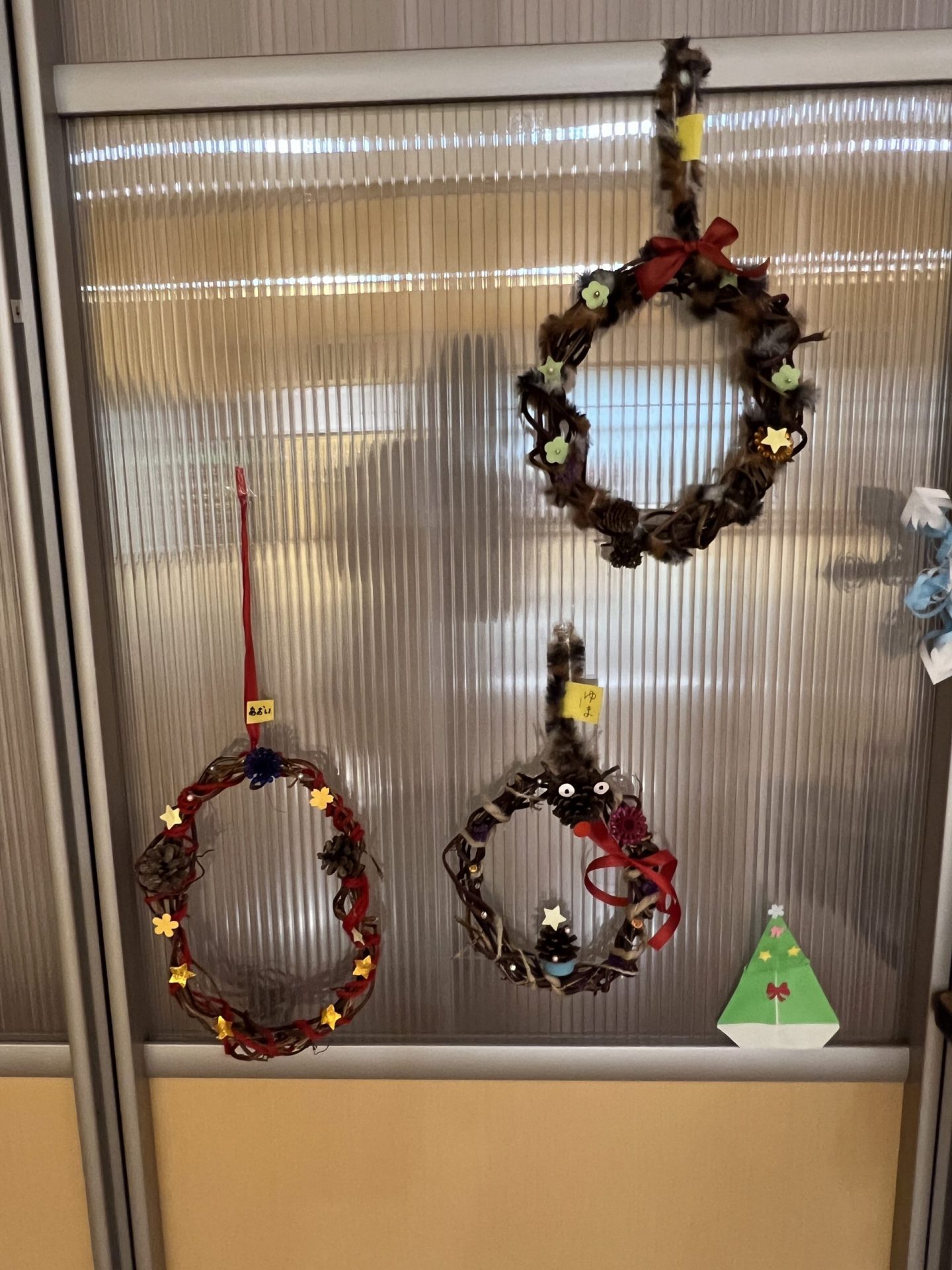 秋に子ども達と作った、さつまいものツルのリースが大変身!!自然物や廃材を使って、ステキなクリスマス☆の飾りになりました!!
