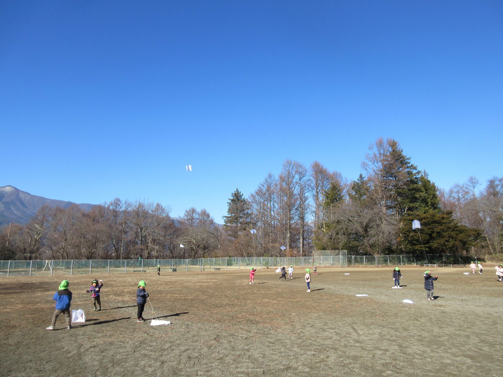 今日はいい天気!年中さんが上のグランドへ凧あげにいきました。 サンタさんにもらった凧。風が弱くてもよくあがります!