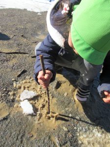 おや?静かに水たまりで遊ぶ子が… 「この中に雪入れると、毒になるの!」 「えっ?」 「だってすぐ色がかわるんだもん!」 なるほど、氷が泥水をすって、すぐに茶色くなる様は 本当に不思議でした。
