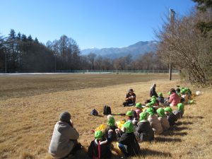 「せんせい!おなかすいた!」 「じゃあ、お楽しみの🍙タイムかな」 「やった!」今日は雲一つなく、中央アルプスがきれいに見えます!