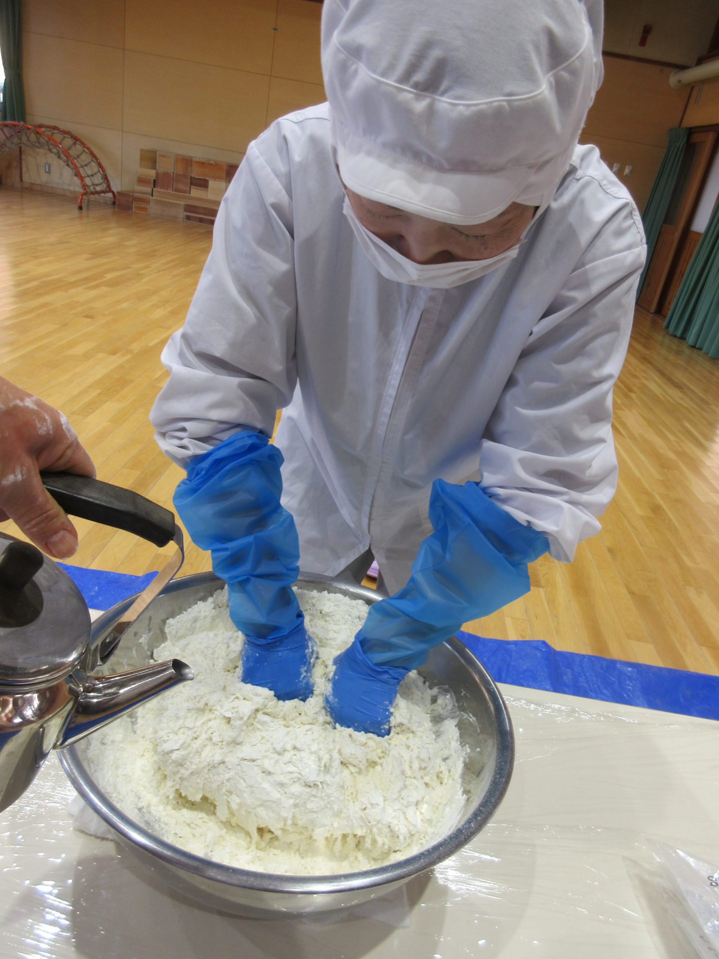 地粉と塩と水で生地をこねます! 手打ちうどんの仕込みです。