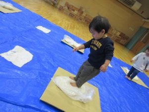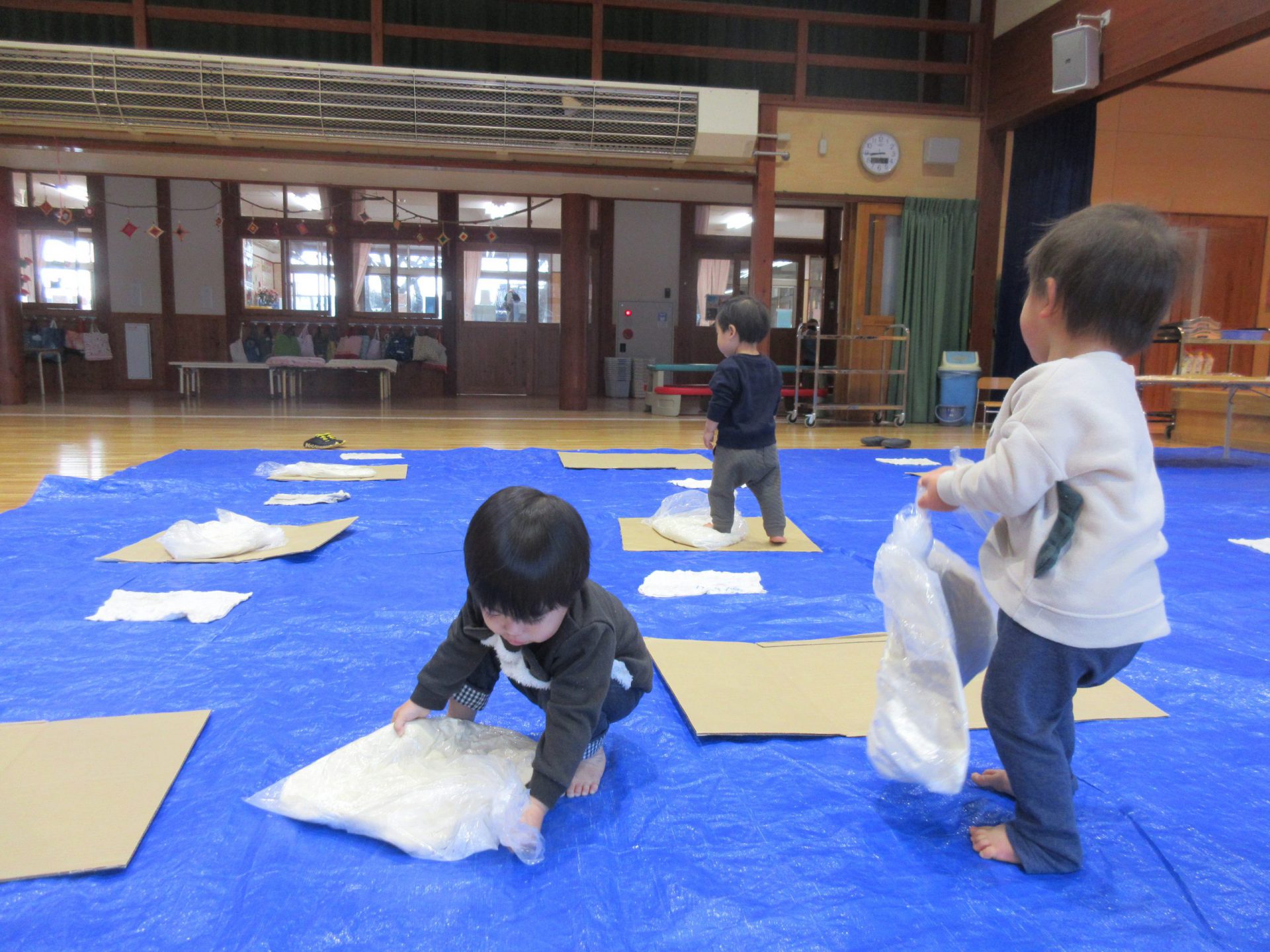 次の日。一番乗りは0,1歳児さん。感触をじっくり味わっています。