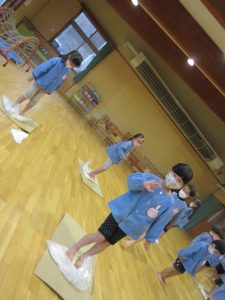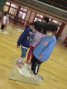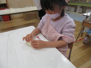でっちる(伊那の言葉でよくこねる意味)うちに生地に粘りが出てきました「すごいね」「でもね。これだとおいしいうどんにならないんだよ」「え?」「皆が踏んでくれると、もっとのびておいしくなるんだよ」「やるやる!!」