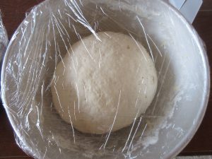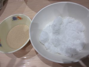 さて、別の日は、中力粉に、砂糖とドライイーストをいれ、ぬるま湯で生地を作ります。これはあんまんの生地つくりです。