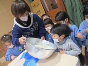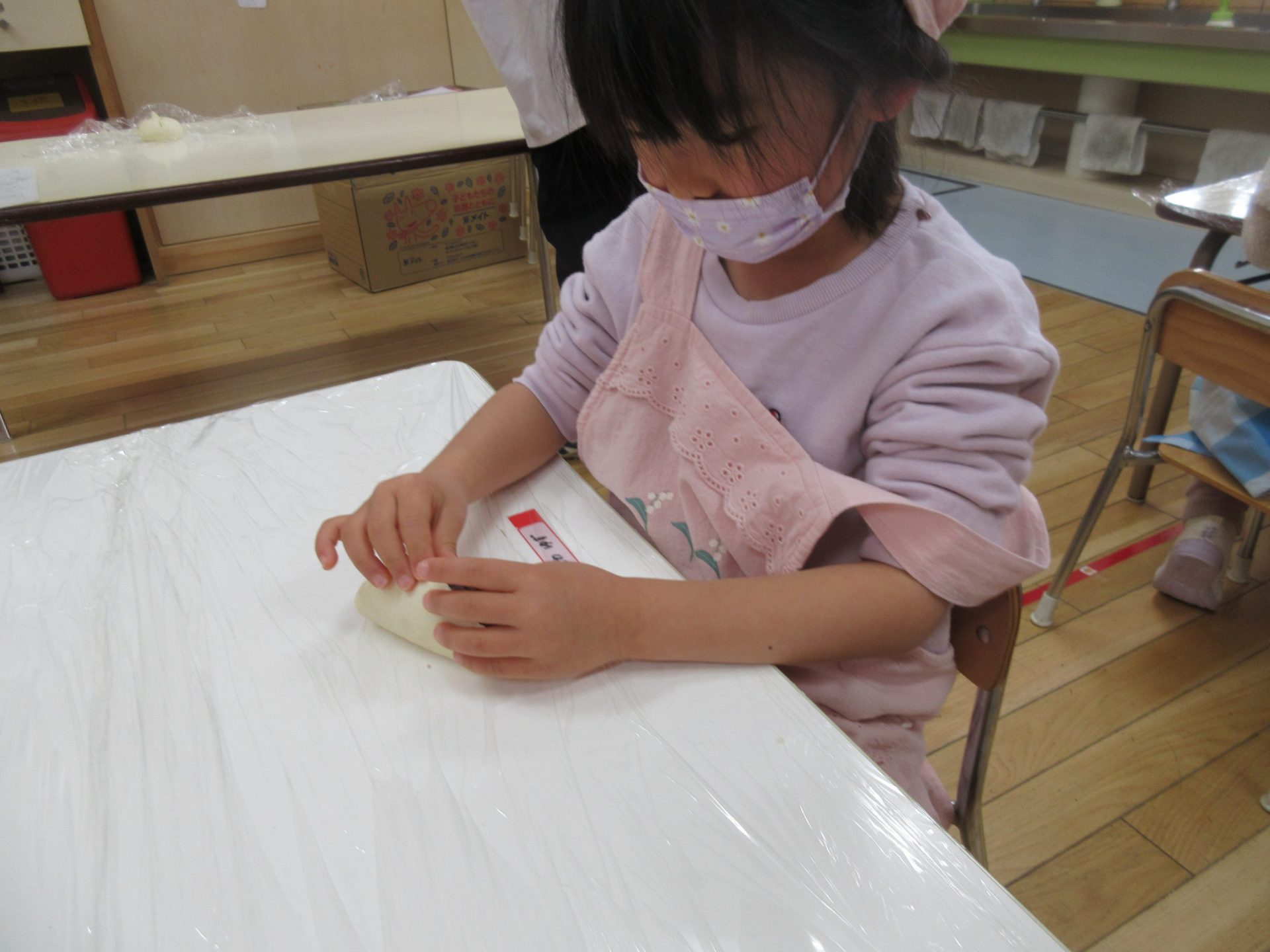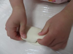 初クッキングの2歳さん。思わず匂いをかぎました。手つきが様になっています。ころころと大切に丸めています。