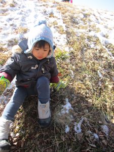 土手に雪が残っていて土手滑りスタート!!でも雪で滑ってなかなか思うように登れない子ども達…手袋をして登る準備完了!歩いて登ってみたり四つん這いで登ったりと滑りながらもなんとか登りきれました