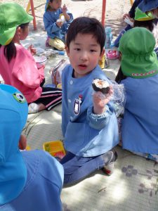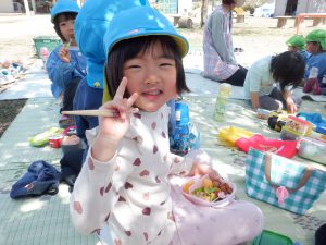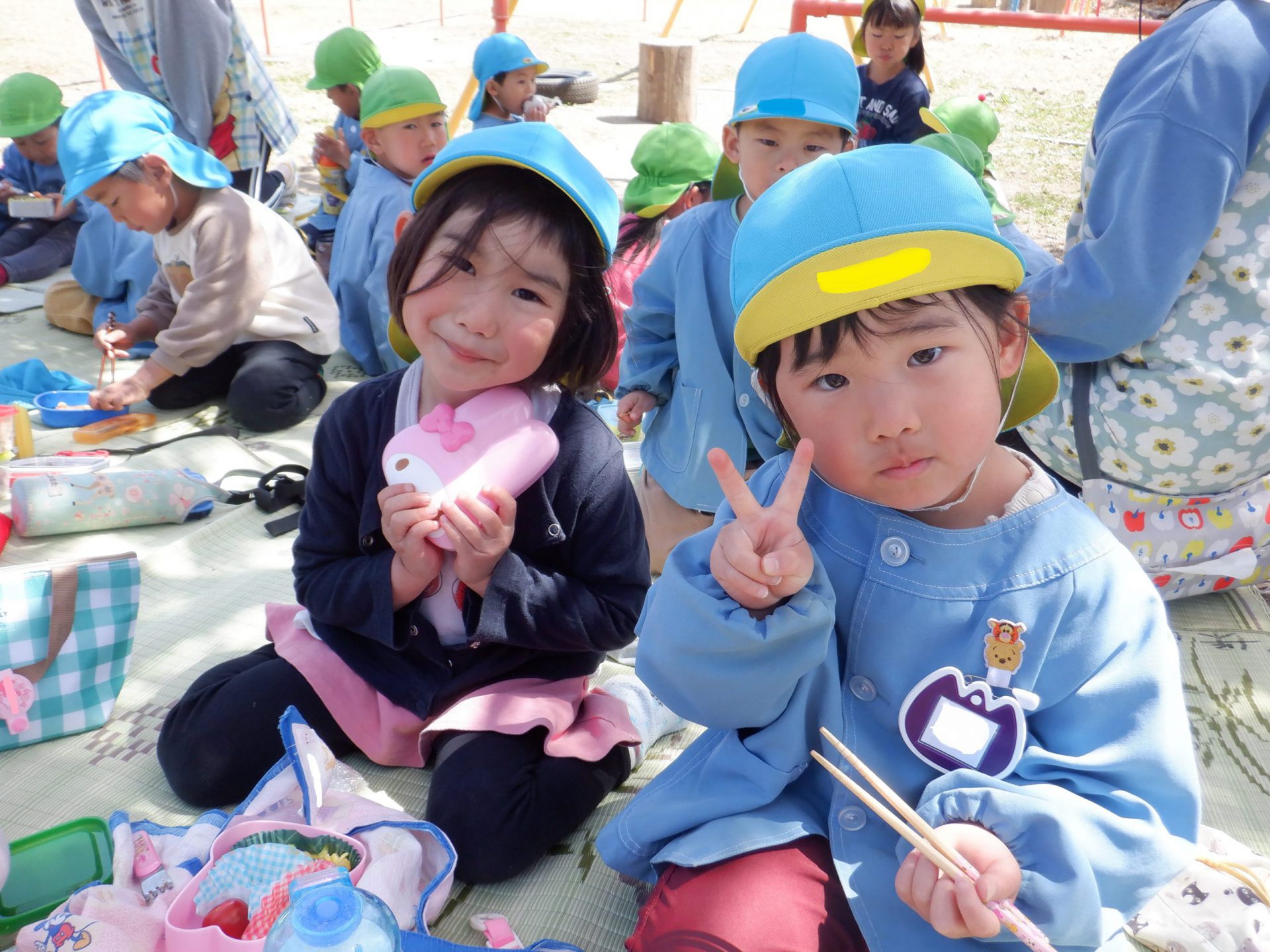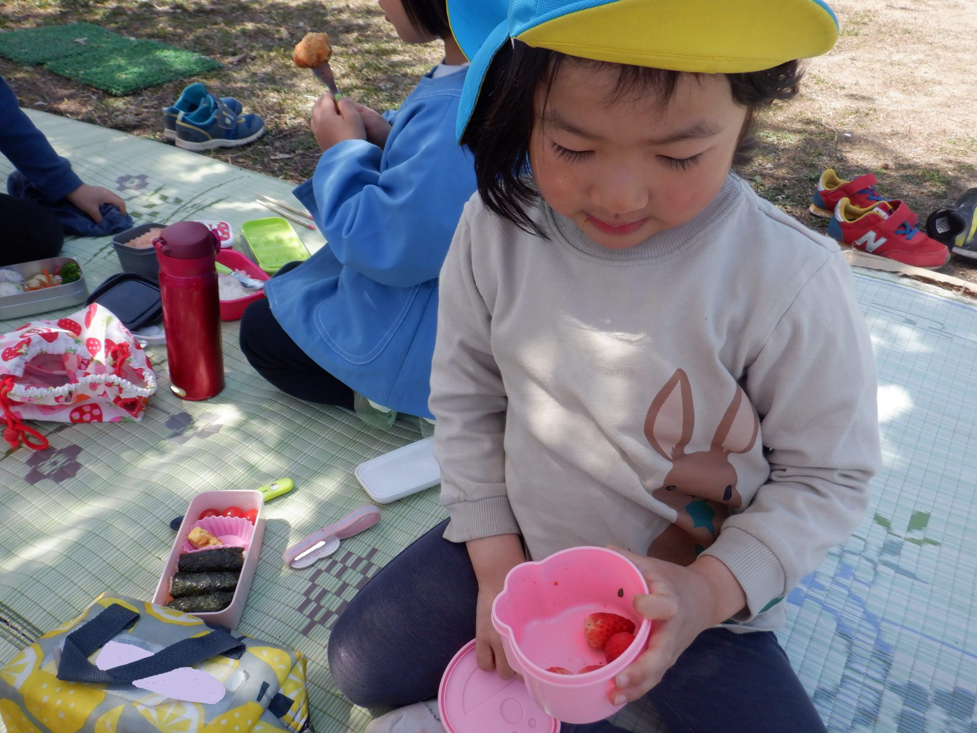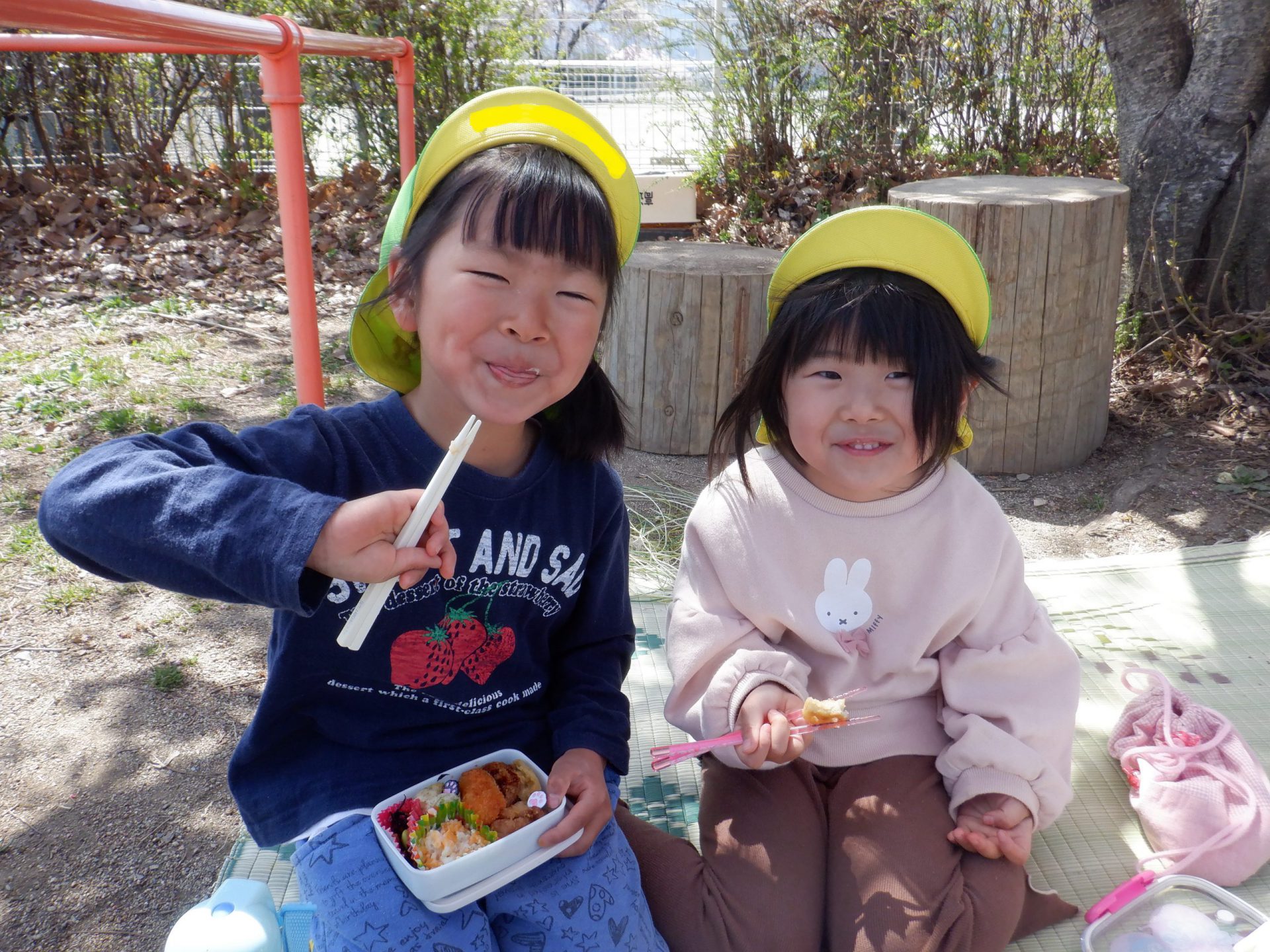 出会いと別れ……新年度を迎えて子どもも大人もドキドキでしたが、そんな私達にサクラが「大丈夫だよ」と優しく語りかけてくれるようでした。もっとも、子ども達は「大きくなった!」というワクワクに溢れているかもしれませんね。あたたかな陽気に包まれ、食べ終わった後もしばらく園庭でゆったりと過ごした子ども達でした。