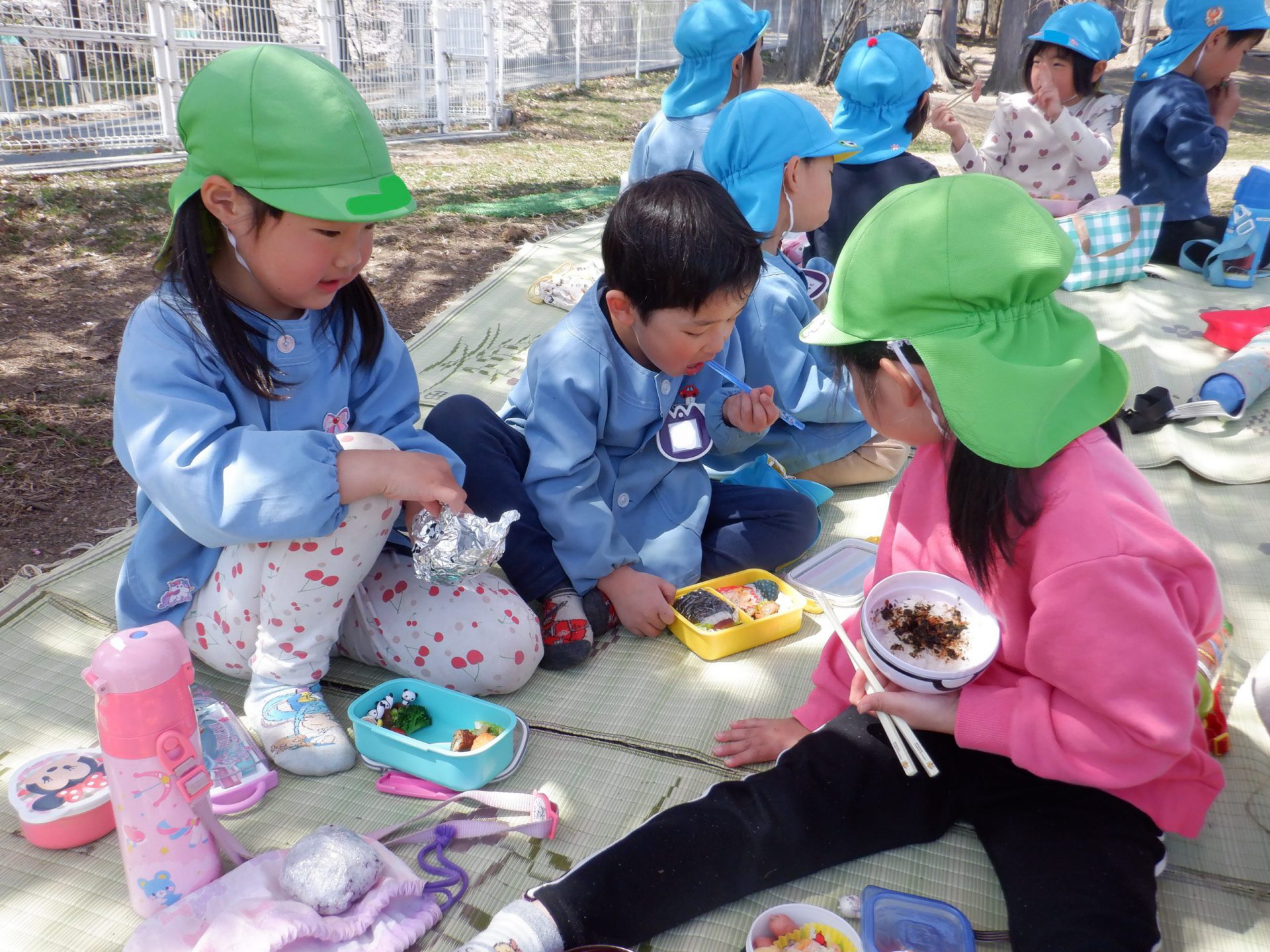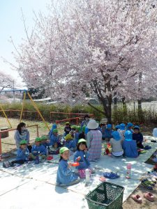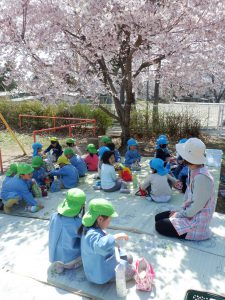 長らく寒かった冬が終わり、とうとう春がやって来ました!無事に入園式を終え、一つ大きくなった年中さんと年長さん。園庭のサクラが見頃となり、「お花見するか!」となりました。