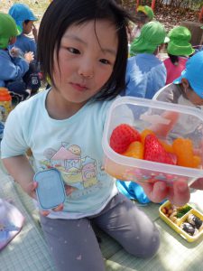 「でざーと、さきにたべてもいい?」「もちろん!」どれから先に食べようか、ワクワクドキドキ!お弁当は子どもにとってのお宝箱なのですね。