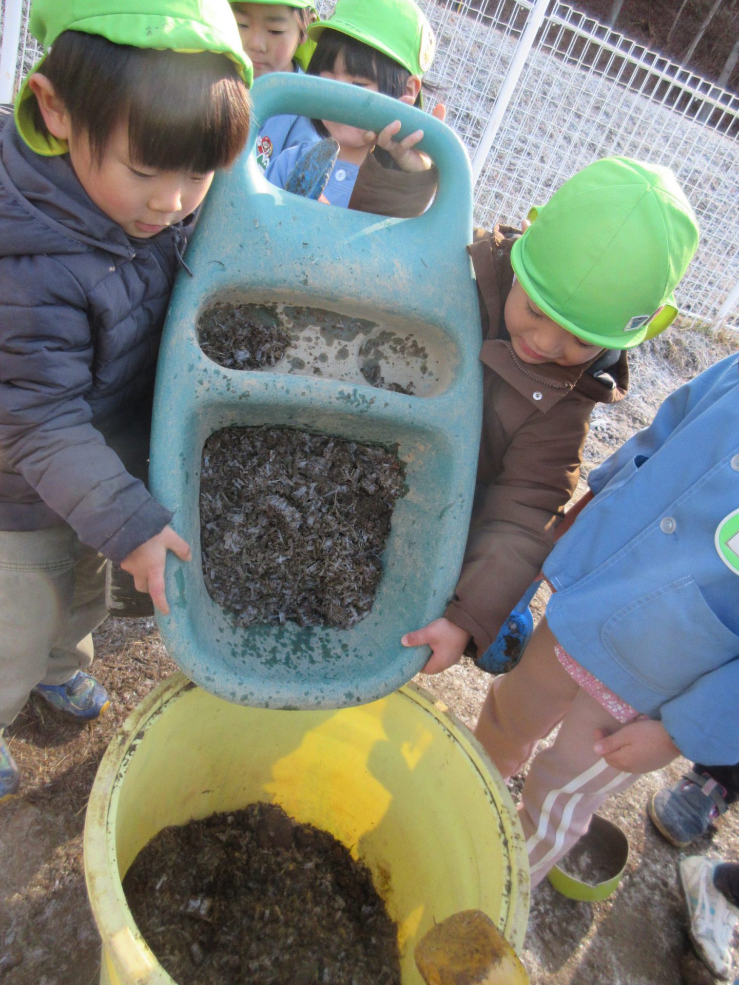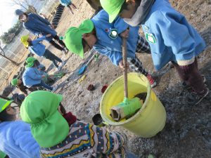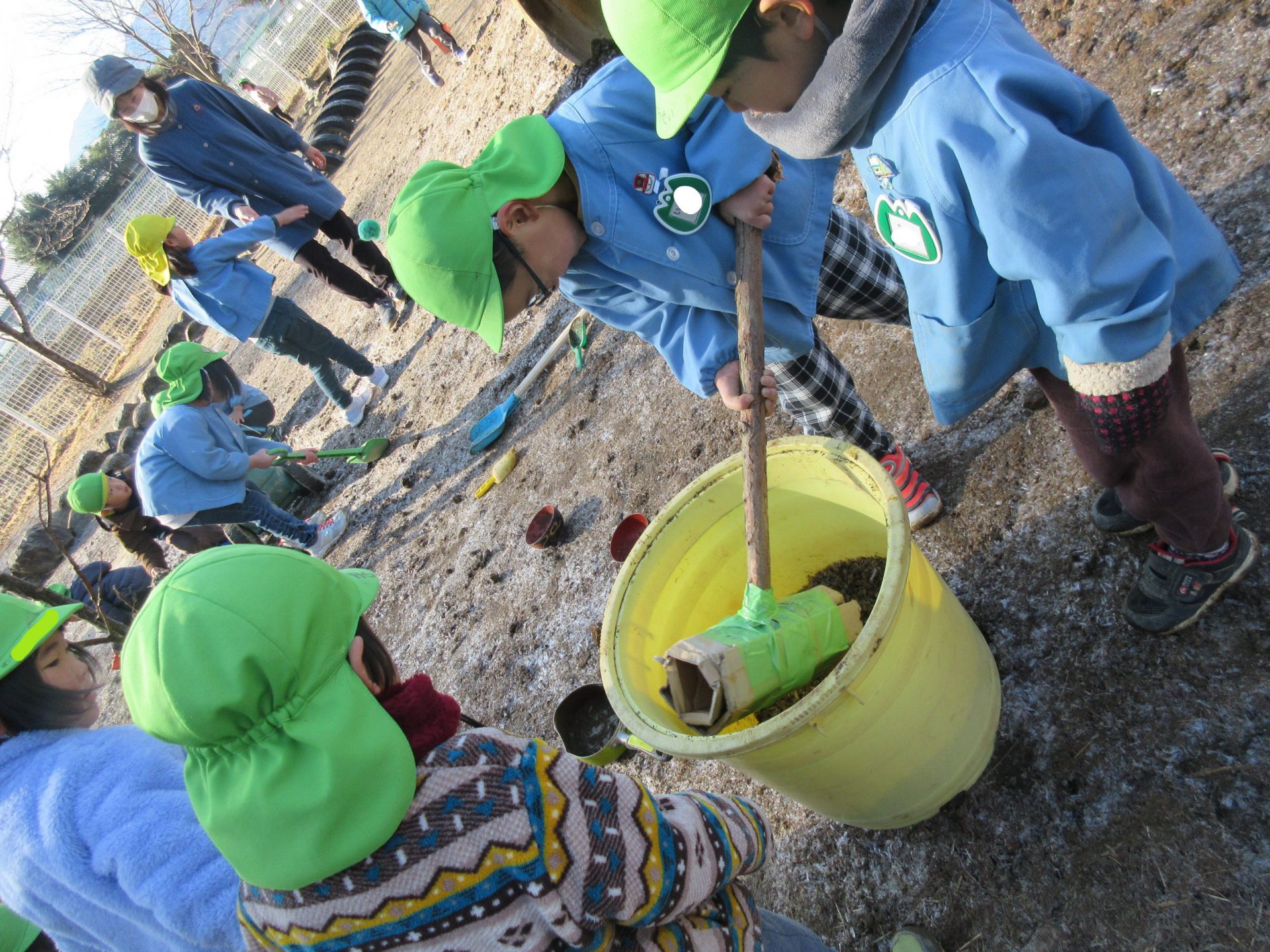 昨年の12月R君たちが、保育園で餅つきを経験した後、庭の霜柱を発見して、それを餅米に見立てて餅つきごっこを楽しんでいました。