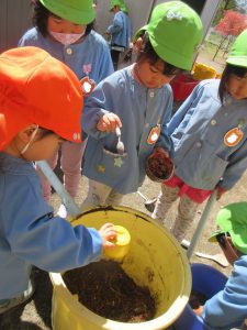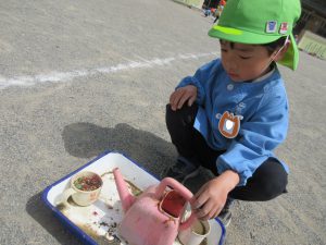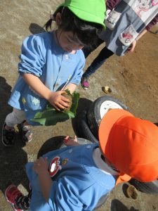 その桜はあっという間に葉桜になり、花びらが散る中「せんせい~。お茶を飲んでください」と 桜や赤いもみじをたっぷりいれた美味しいお茶をR君がいれてくれました。お茶を飲みながら「冬に霜柱で遊んだ餅つきごっこ楽しかったね」と話すと、「じゃあさ!これで桜餅作ろうよ!」と!お餅作り熱に再び火がつきました!