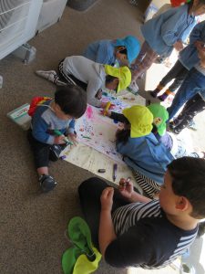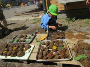 お餅屋さん以外も盛り上がっています。こちらは「宝さがし」チームです。園庭の地図を描いて「おたから」を探しに行くのです。お兄ちゃんと一緒に参加する1歳のK君も地図を描いてますよ。