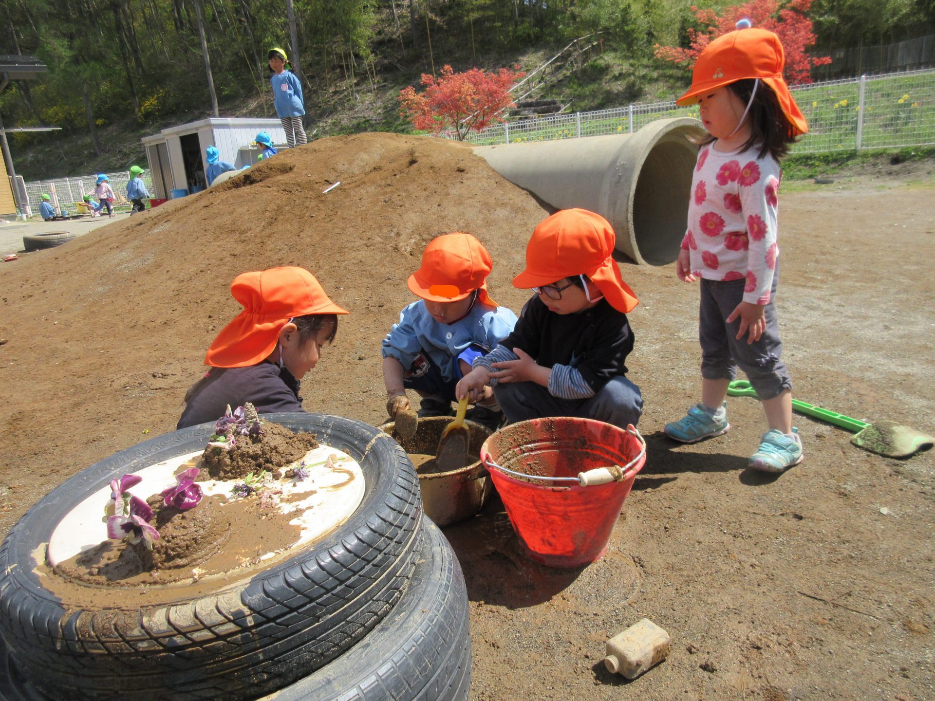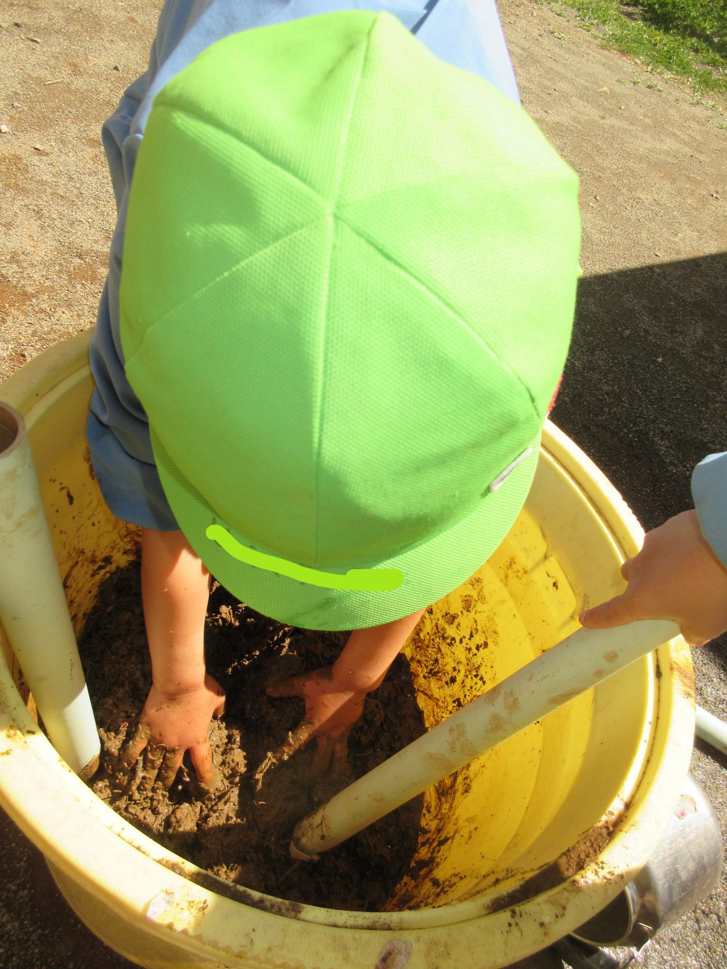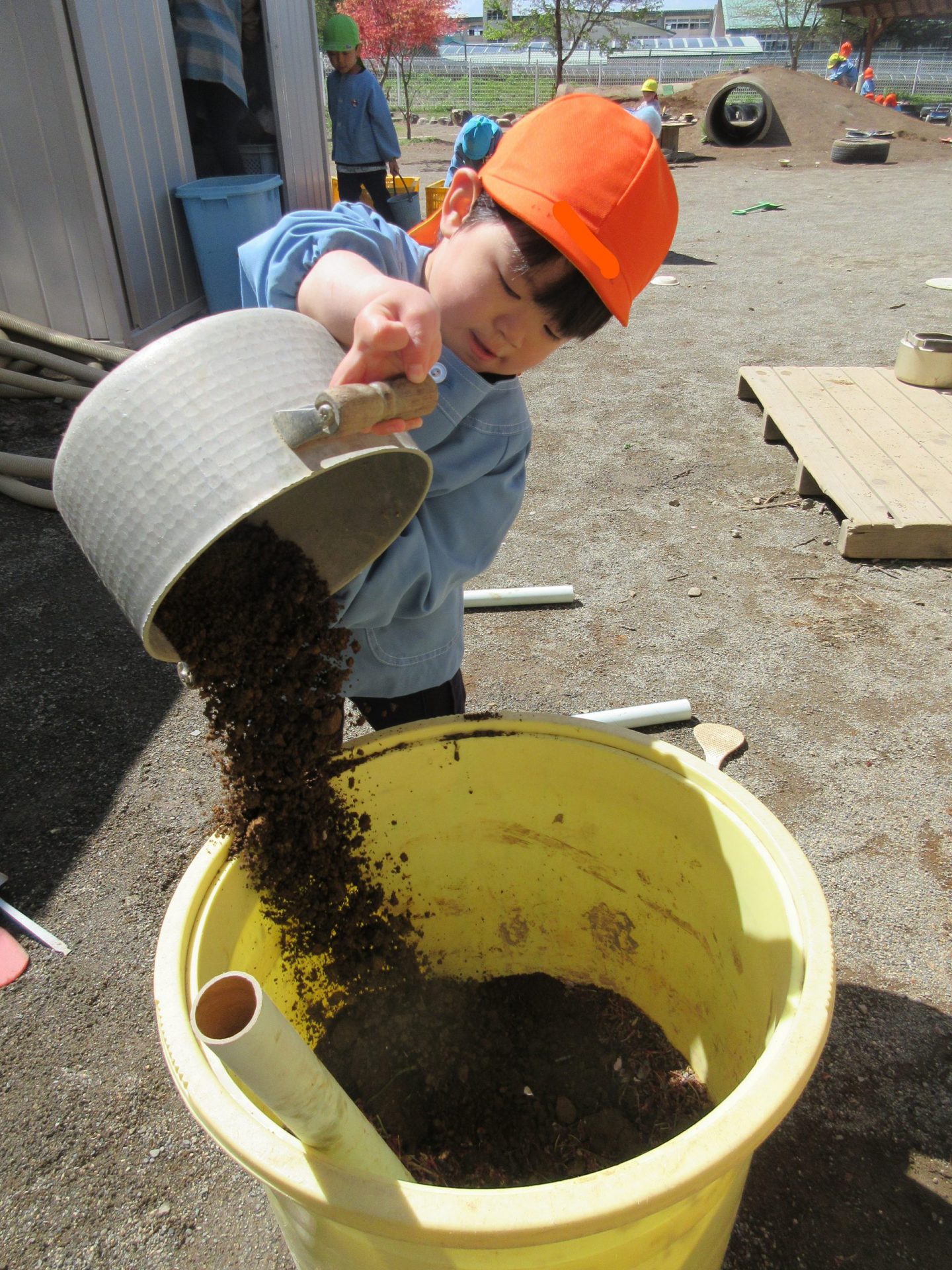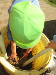 手返しをちゃんと覚えていて「たしかこうやってやるといいんだよね。」と泥をでっちる姿。手水のバケツを用意して本格的です。