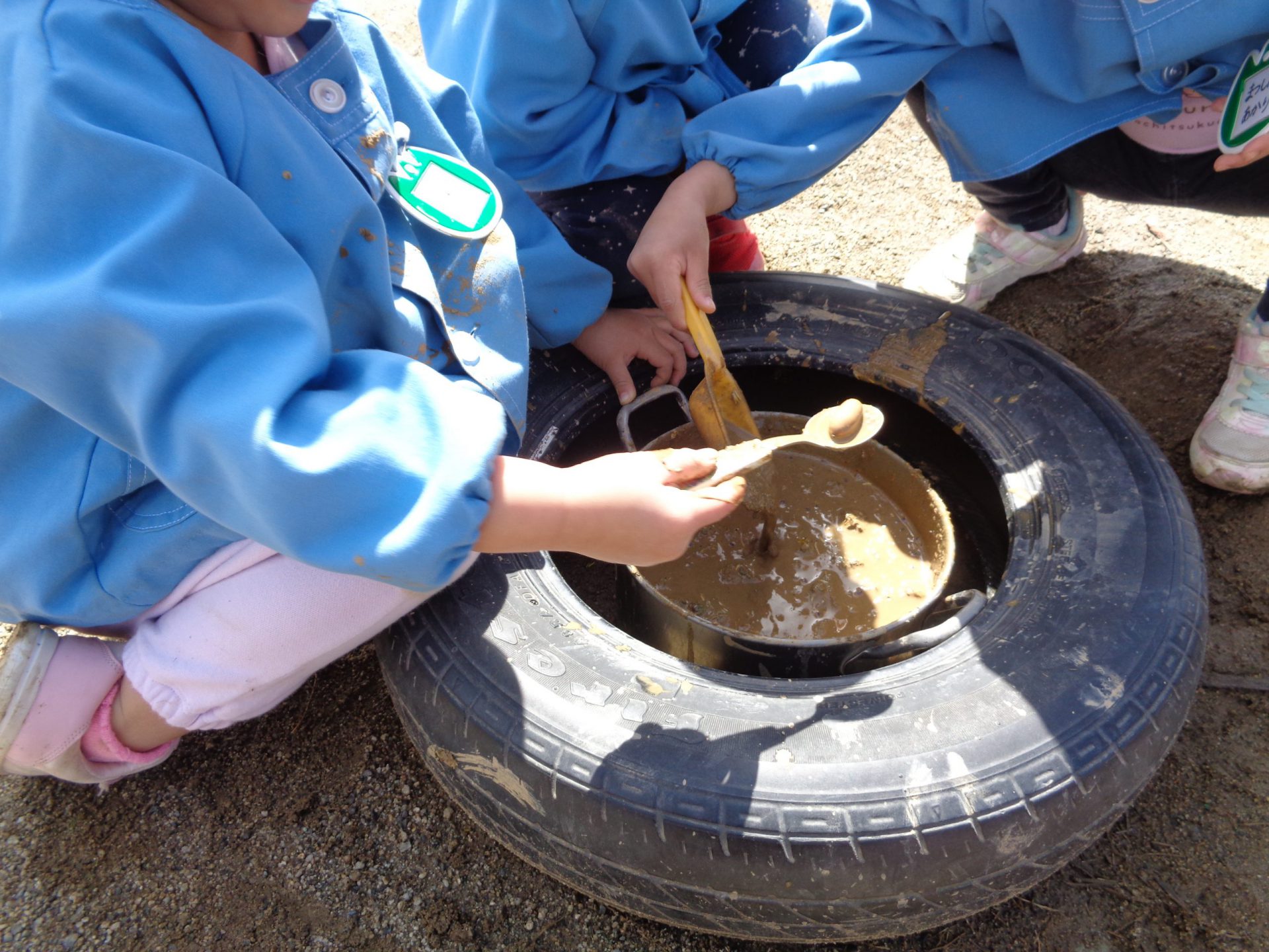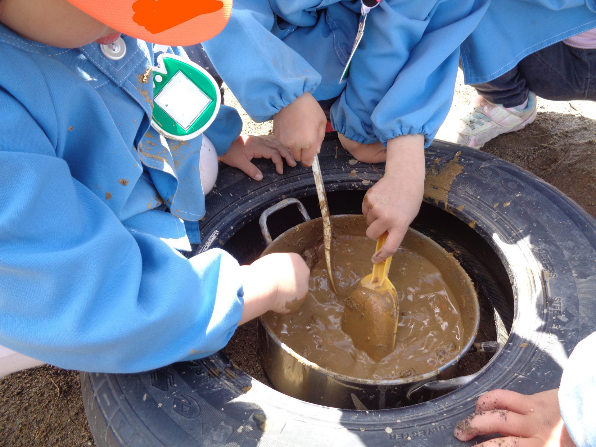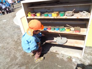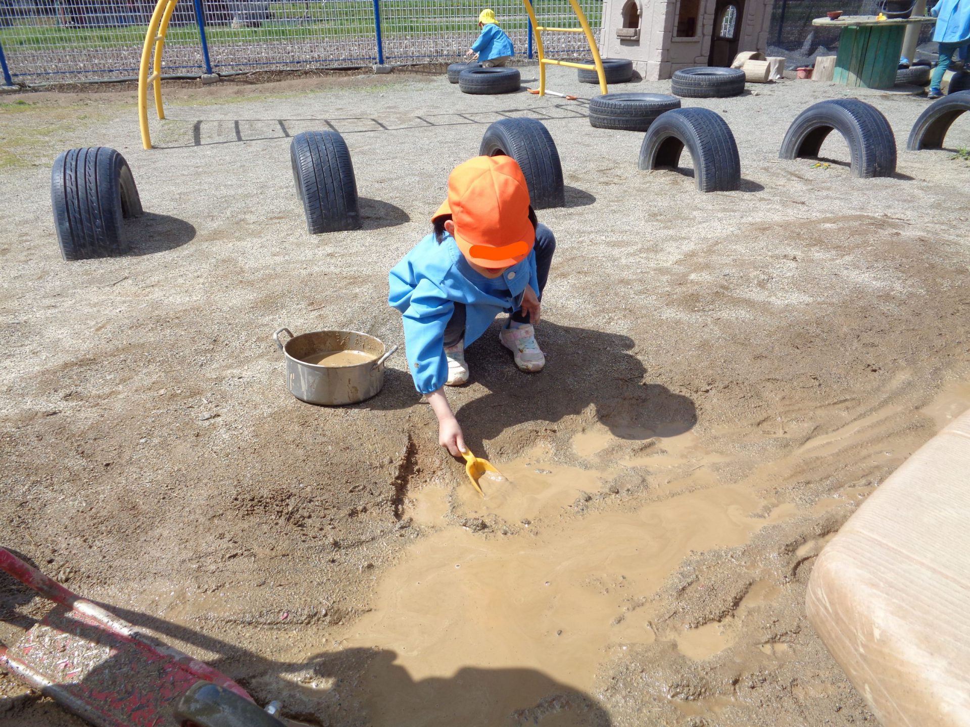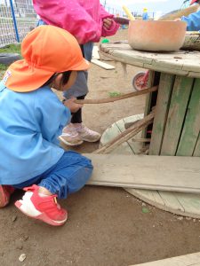雨上がりの日、園庭に水たまりができていました。この日も登園をするとすぐに外へ飛び出していき、水を発見。!!スコップで上手にすくい取りお鍋に集めます。