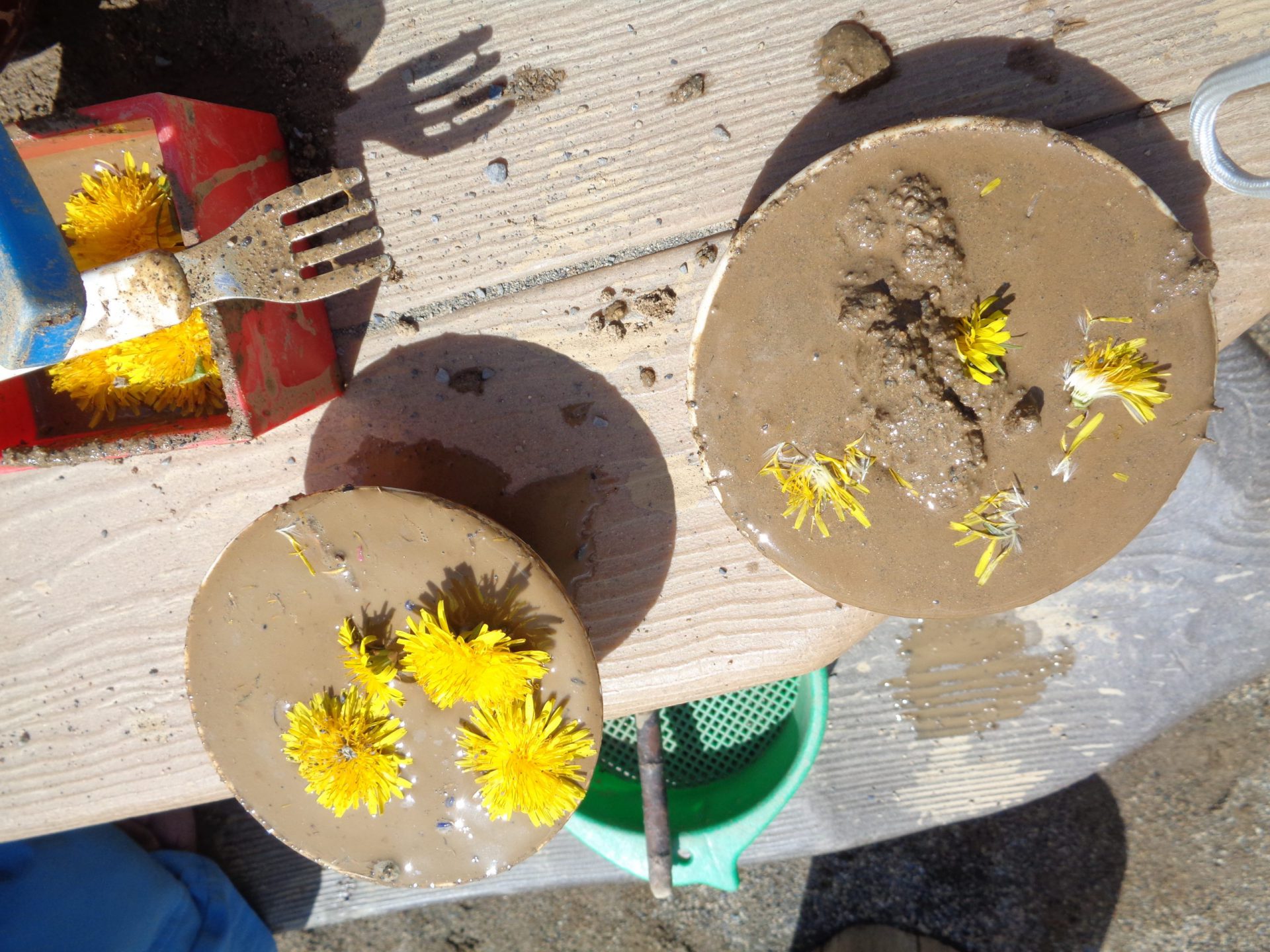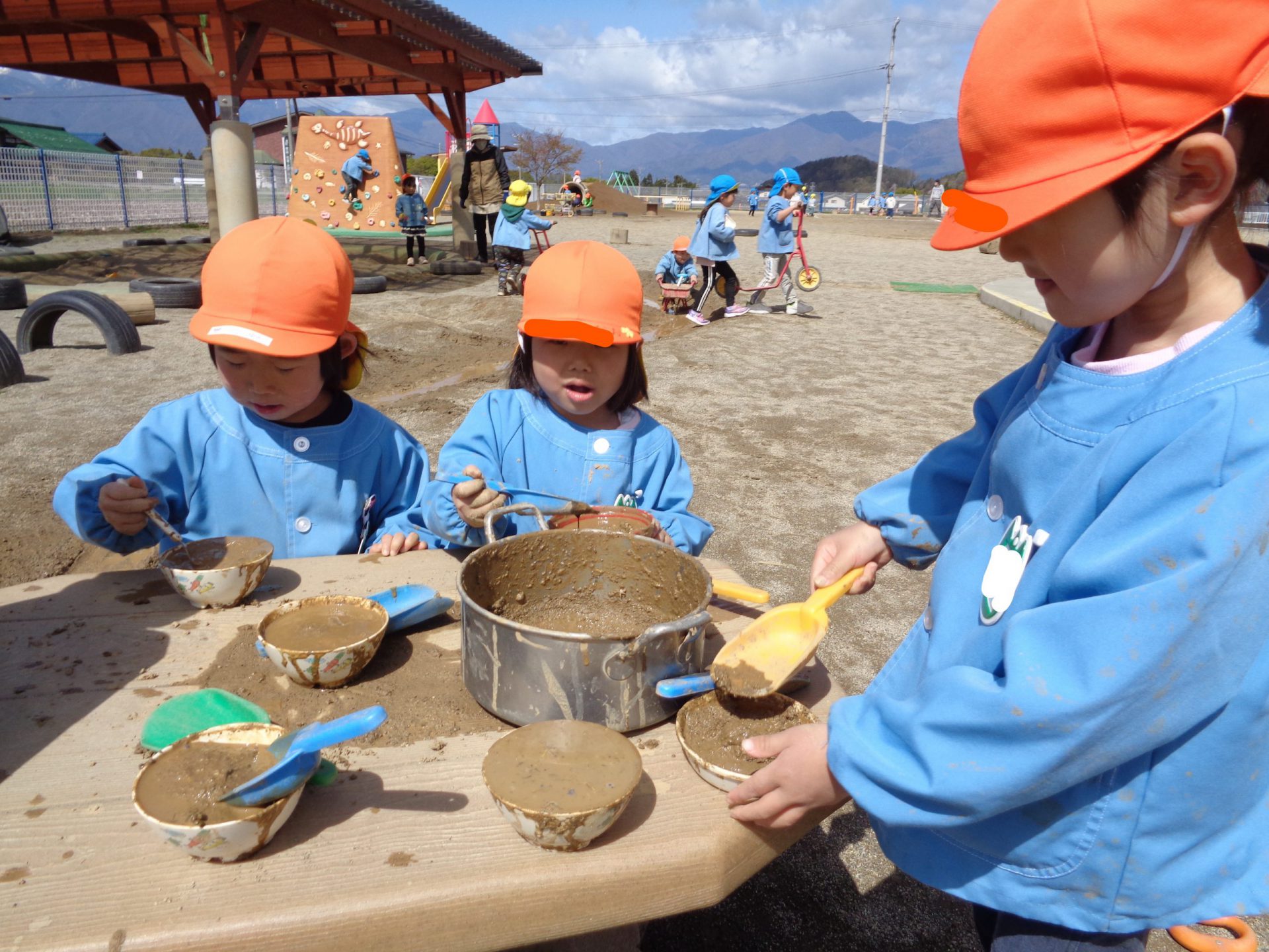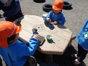砂を「砂糖と粉、それから塩!!塩はしょっぱいから少しだけ入れて~」水を「お醤油は少しだけ~」と身近なものを見立ててごはん作りも始まりました。