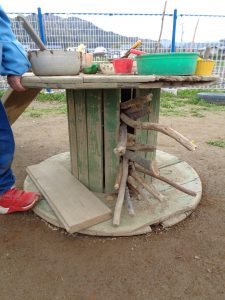 「ここはストーブです。熱いので気を付けてくださ~い」とストーブに大変身。木の棒がストーブの薪に、ケーブルドラムの隙間がストーブの口になりました☆