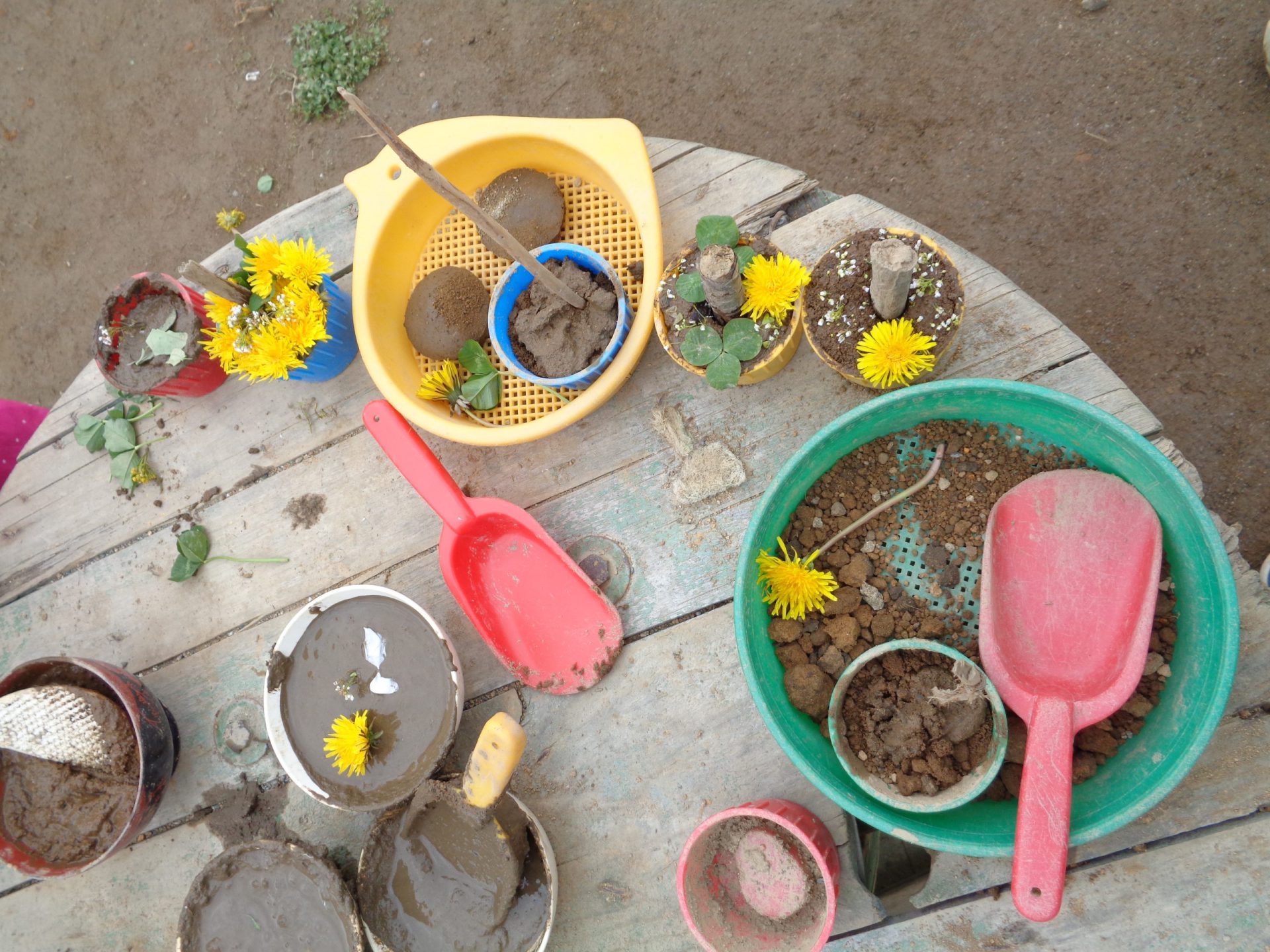 園庭に咲いているタンポポやクローバーを摘んで飾り付けをして完成です☆クローバーをたくさん集めてお鍋に入れてサラダや野菜炒めも出来上がりました。