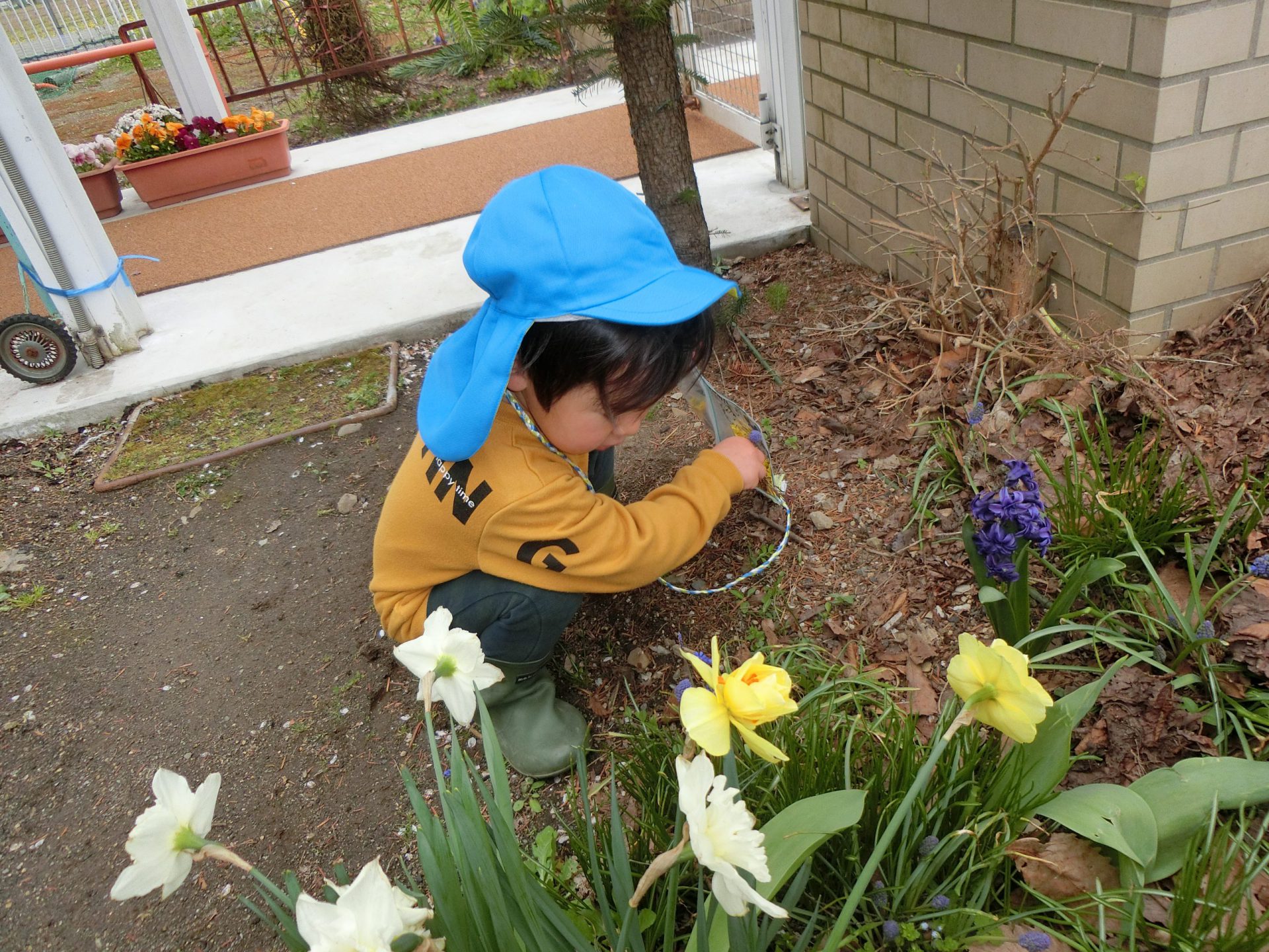 年少さんが園庭でお花を摘んでいます。摘んだお花は、お散歩バックに入れていきます。