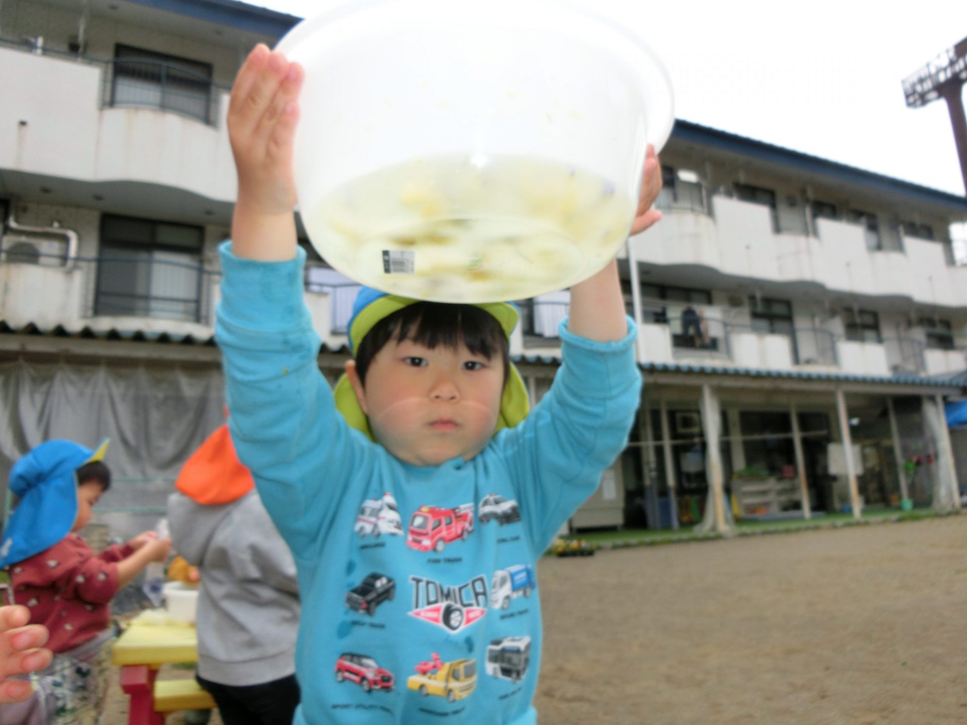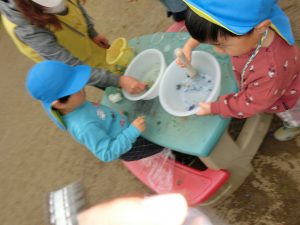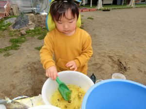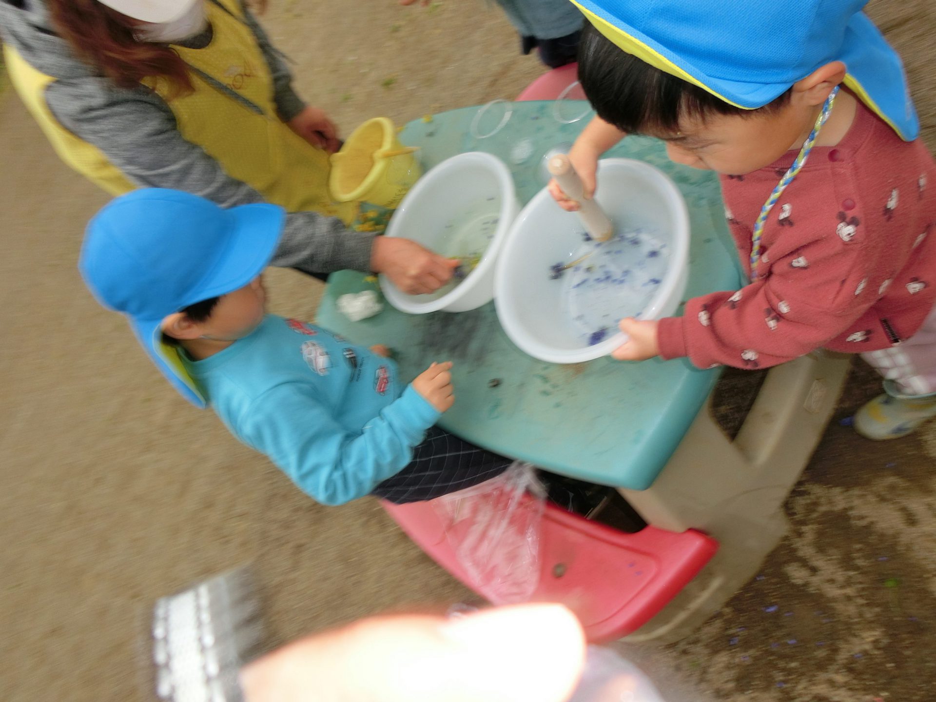 お友達がやっているのを見て、挑戦してみます。“すりこぎ”が売り切れていたので、(どうするかな?)と見ていたら、形の似ているシャベルを持ってきて挑戦しています。ほら、きれいな黄色が出ています。自分で工夫できる年少さん、ステキですね♪