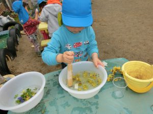「せんせい、やって!」黄色いタンポポを少し混ぜると「でてきたー!」とっても嬉しそう。
