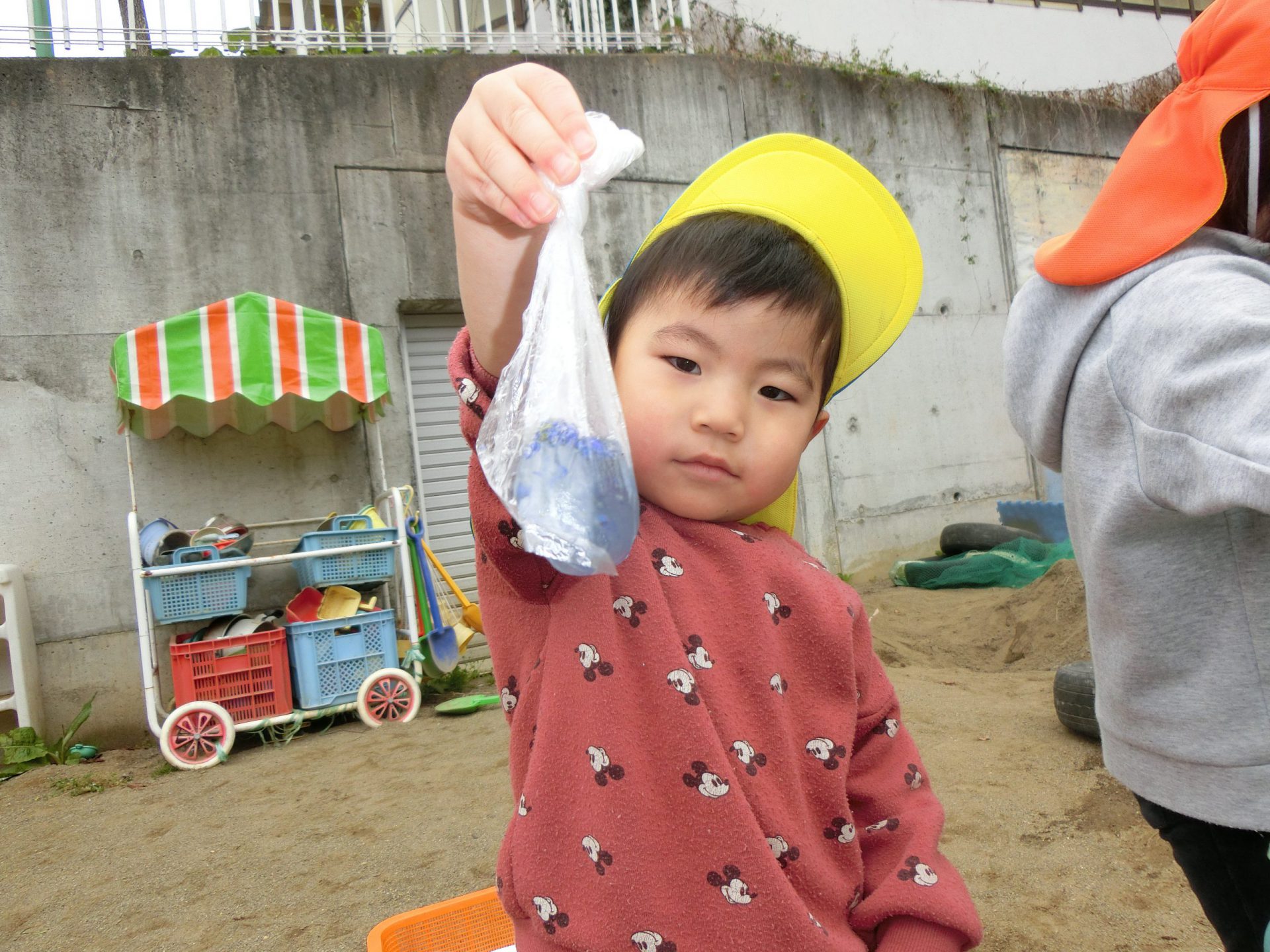 今度は見事に色が出ました!袋に入れてモミモミする方法を教えてもらったようです。さすが年中さん、物知りです!