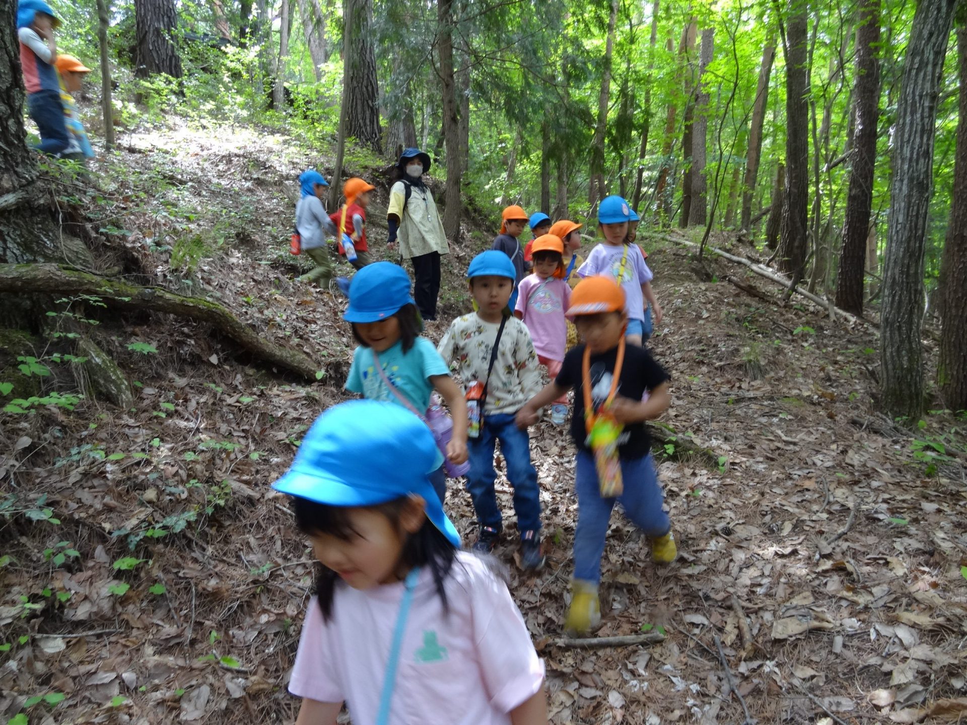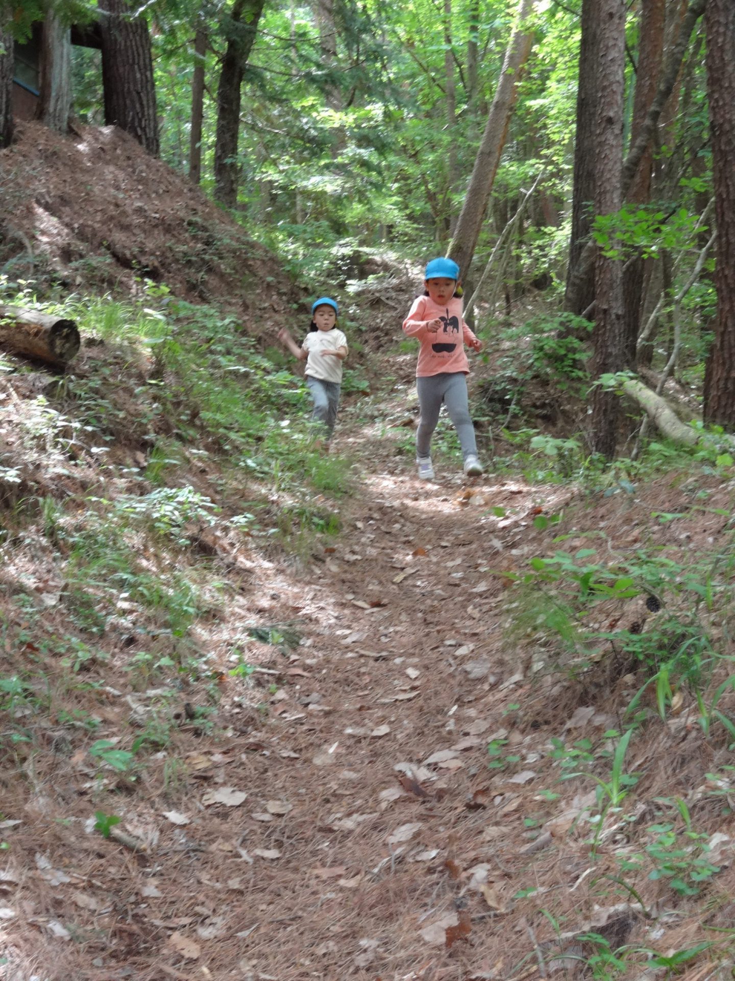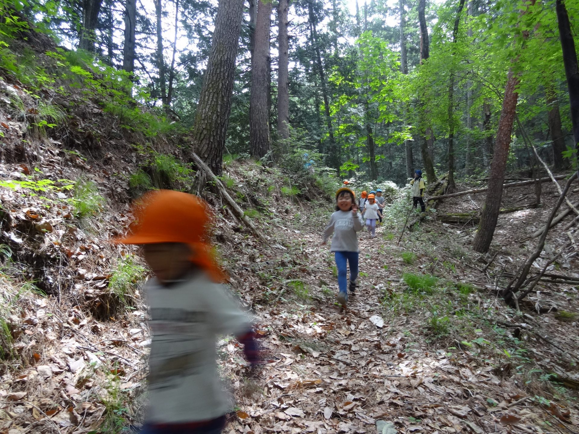 「ここはジェットコースターができるんだー!」「ビュンビュン走るんだよ!」と楽しみに険しい山道も歩いていきます。