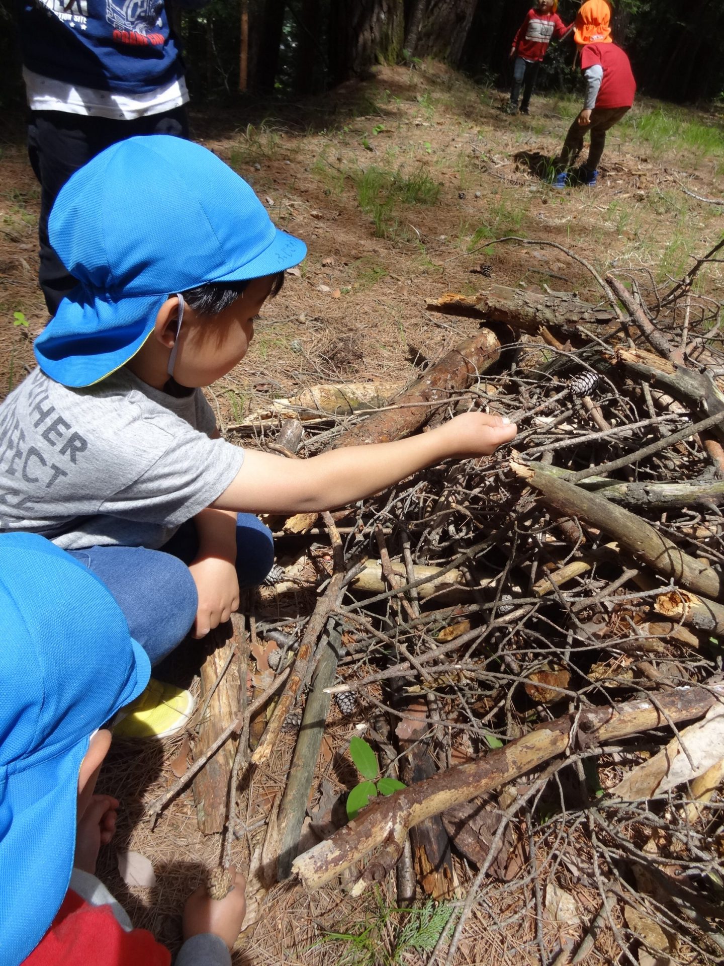 こちらは落ちている木を集めてバーベキューごっこ中!!