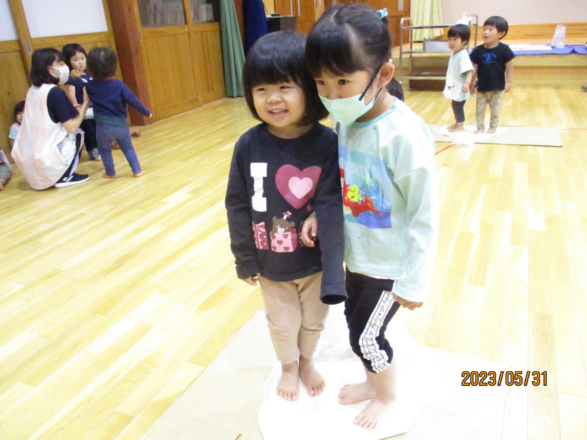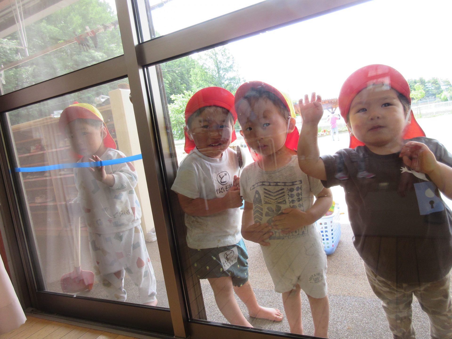 年長さん達なにしてるのかなあ?楽しそう?と、未満児さんがテラスからじっと見ています。明日、皆さんも踏んでくださいね。