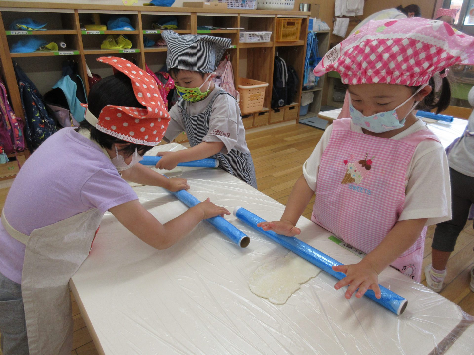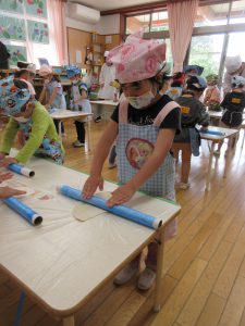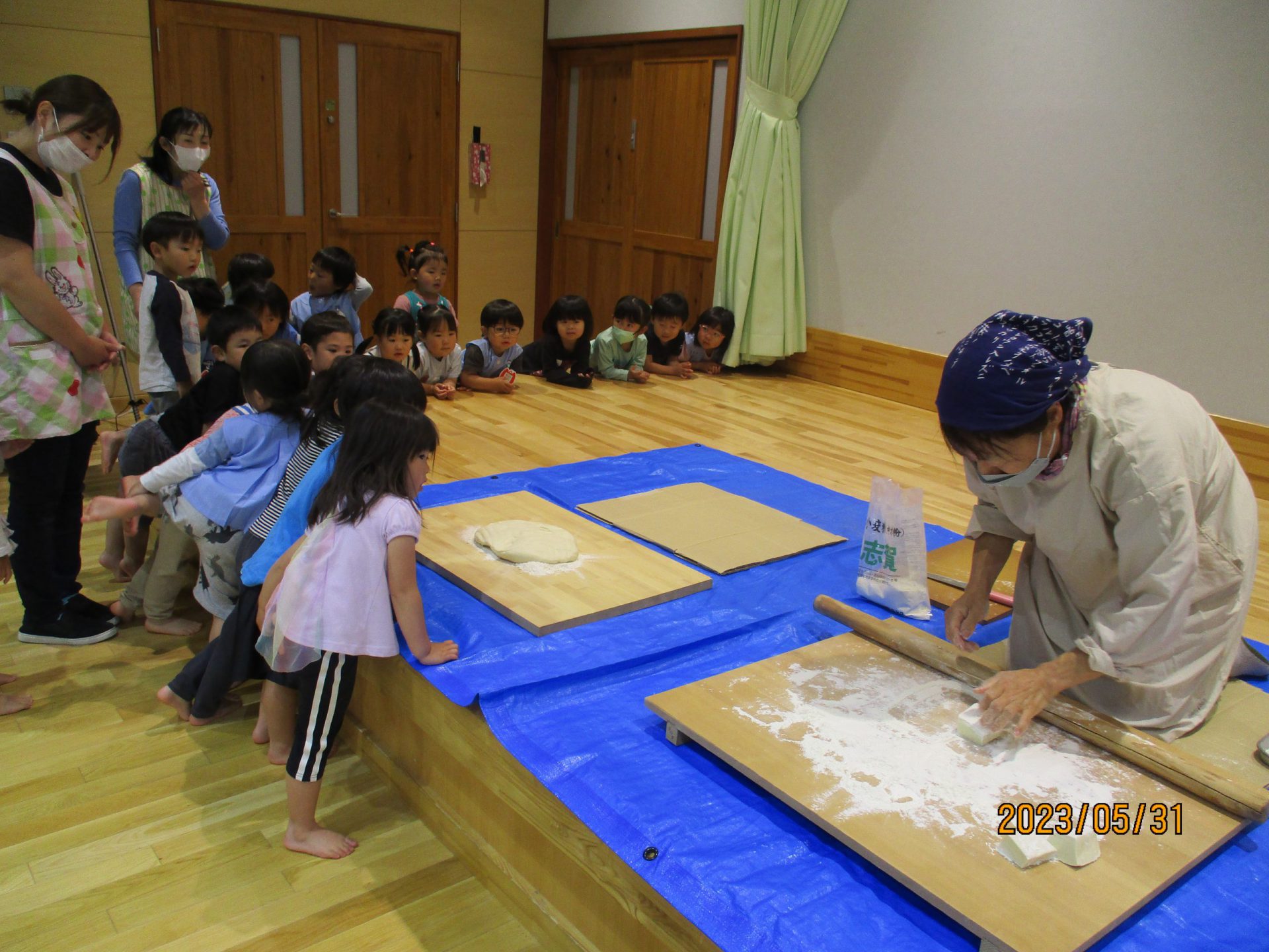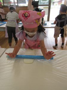 今年は年中・長さんにものばしてもらいます!打ち粉をしっかりふってのばします。子ども達がしっかり踏んでくれたので強い生地ができました。