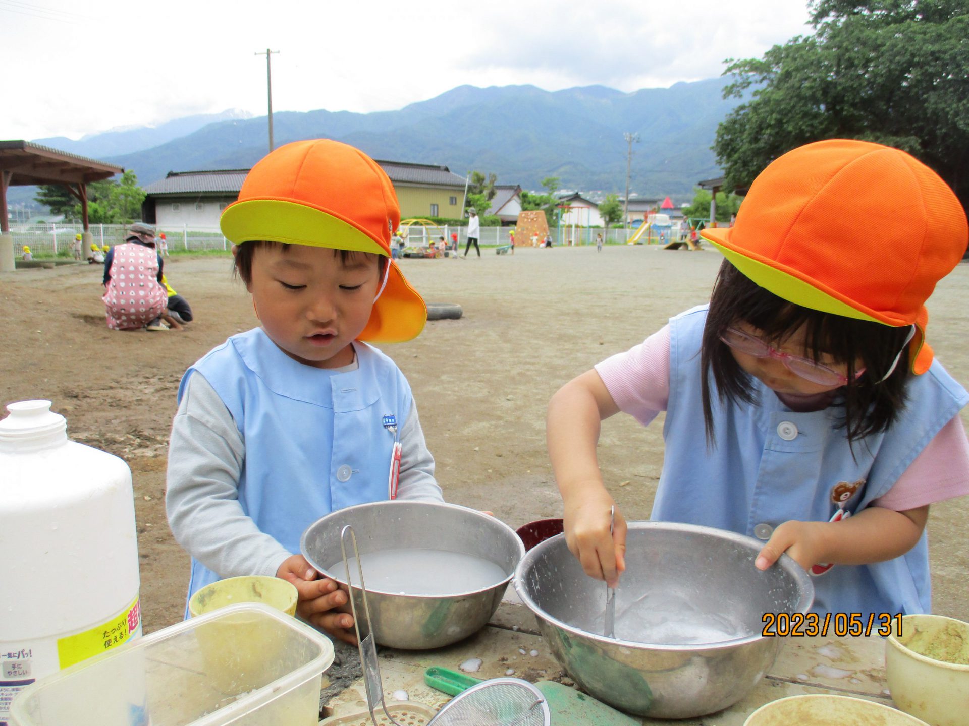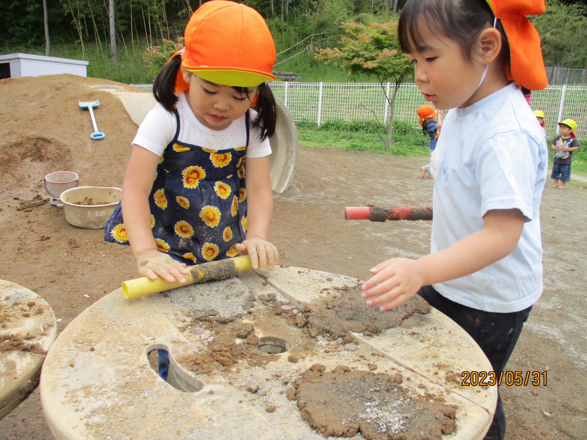 うどんをのばすところを見学し、外へでた年少さん。早速うどんつくりがはじまりました。