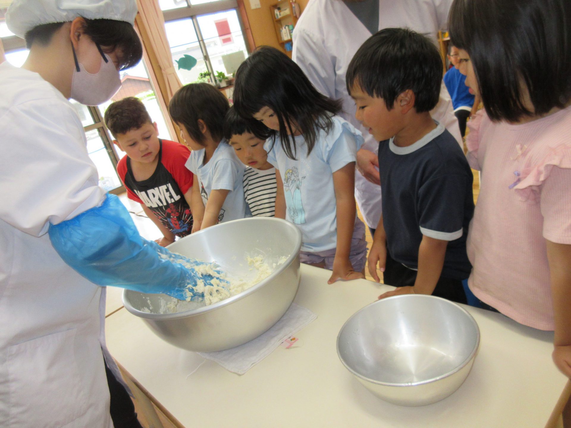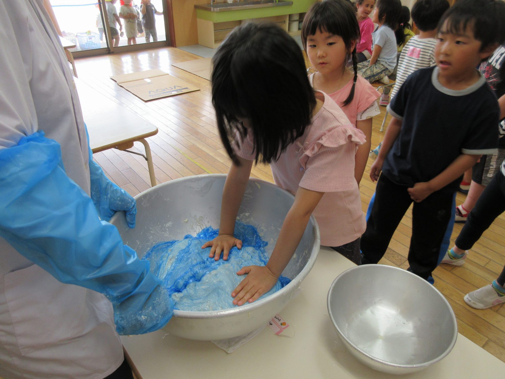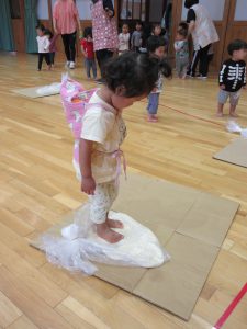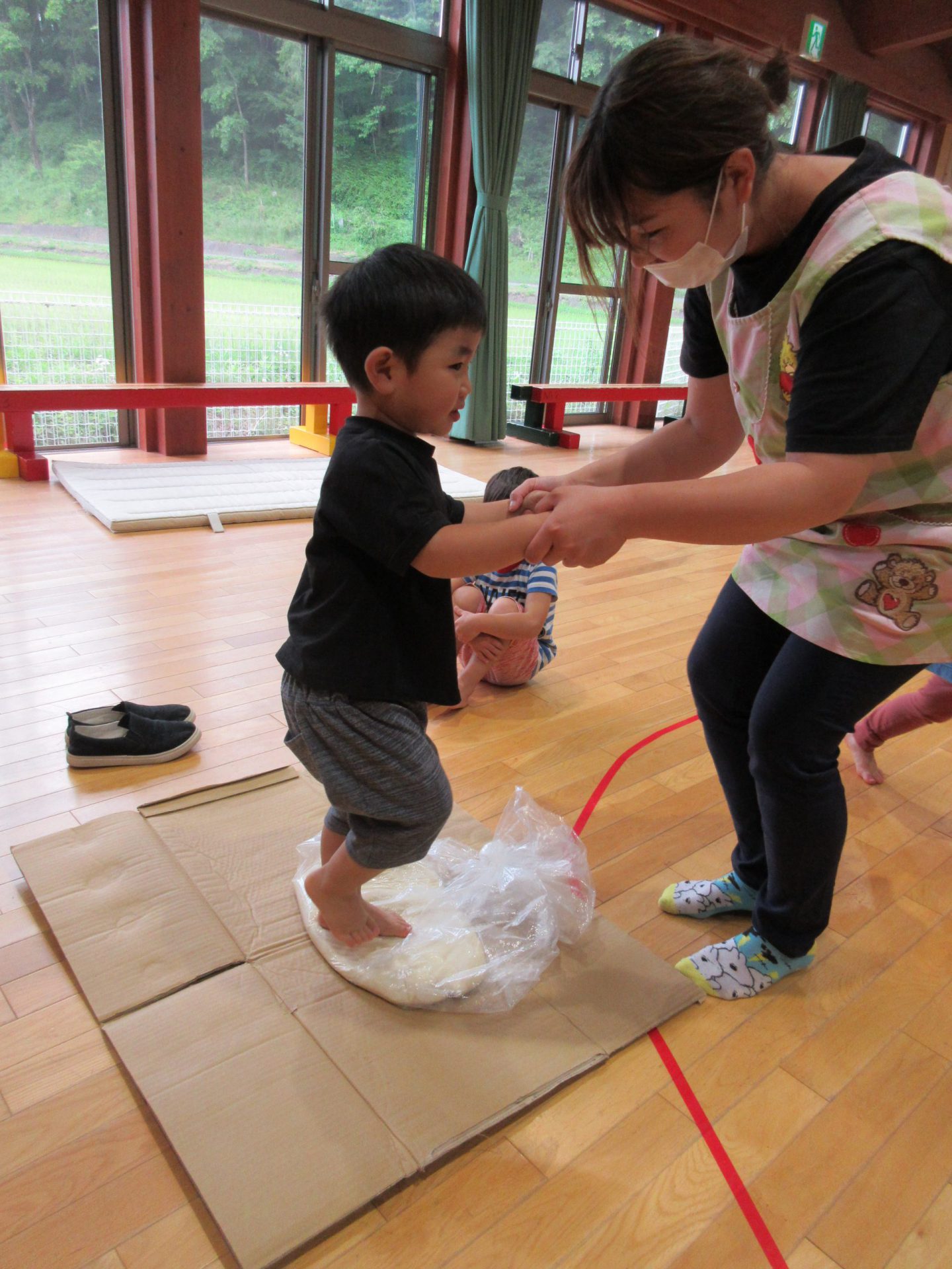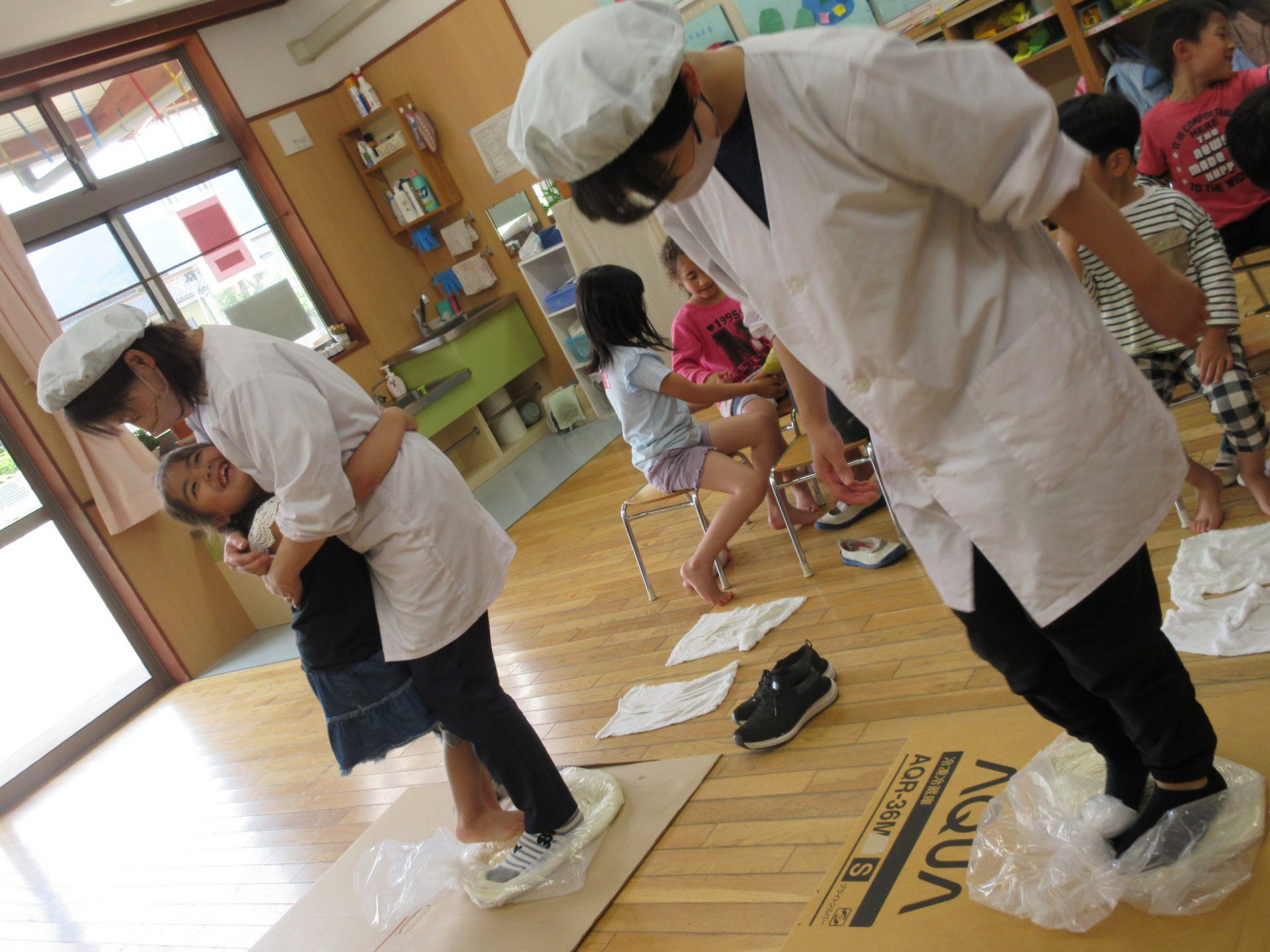 さて、次の日。一晩寝かせた生地を未満児さんと年少さんが踏みます。待ってました!