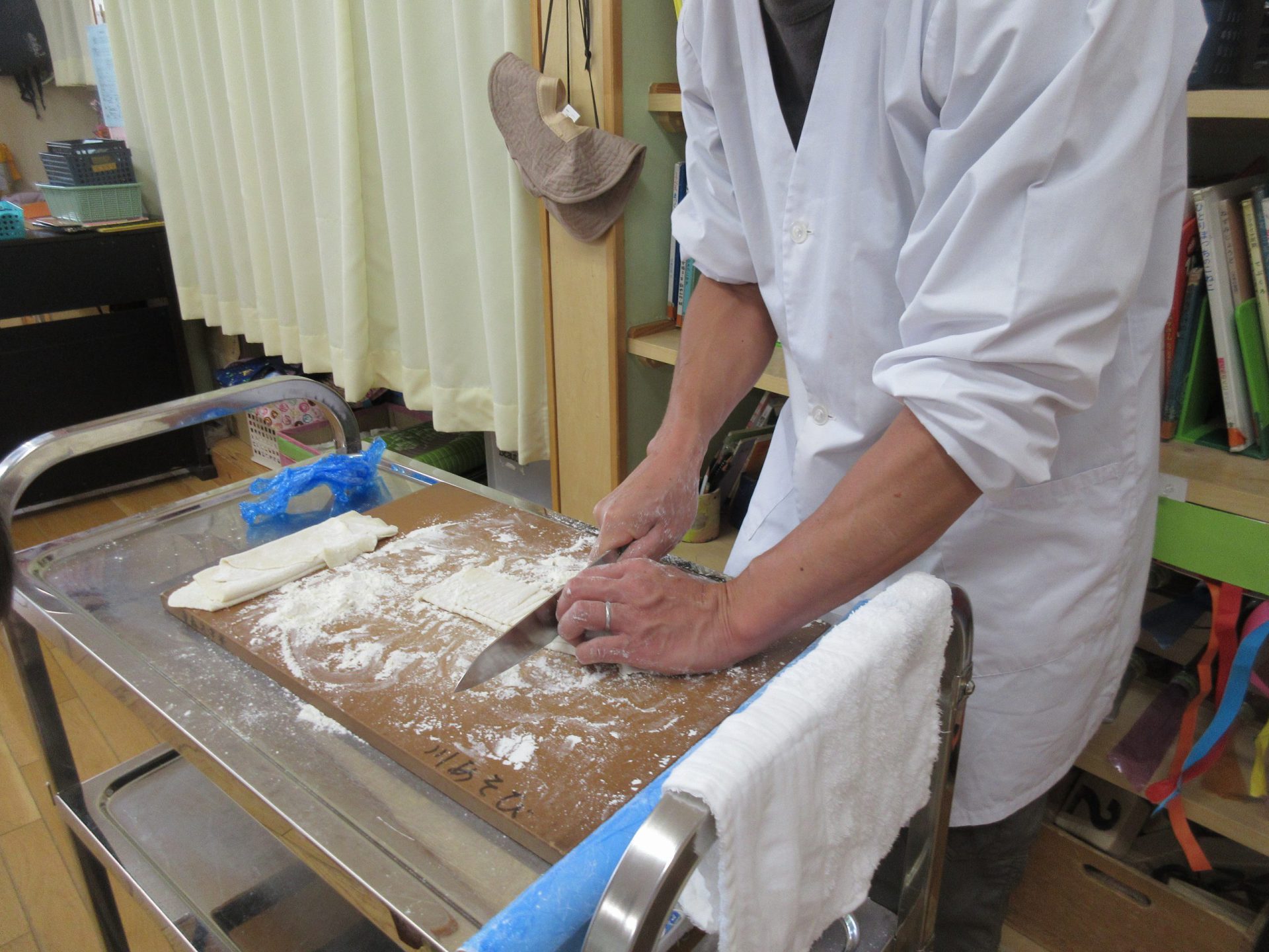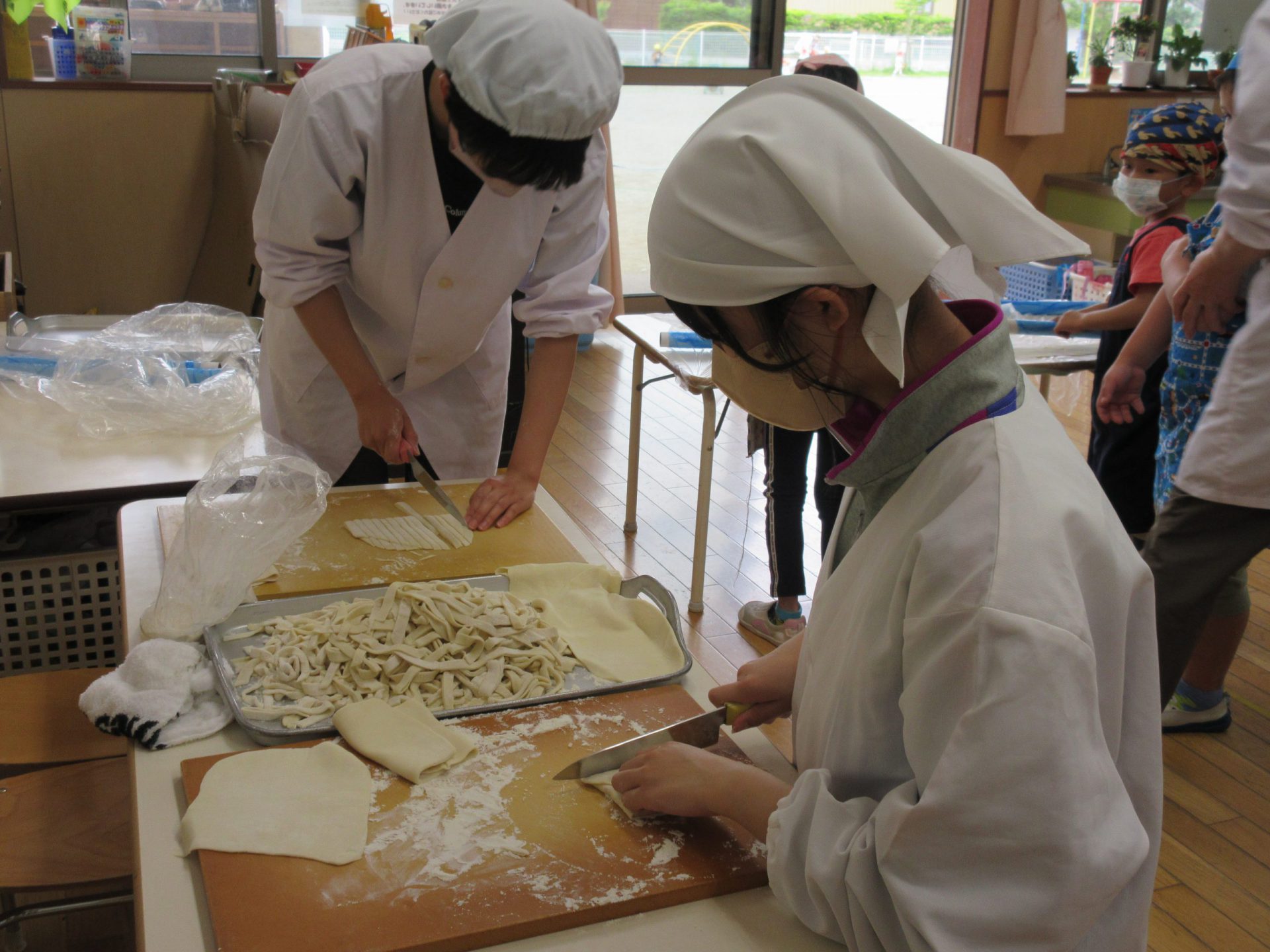 段々慣れてきた子ども達ののばすスピードがすごい!職員や職場体験の中学生が一生懸命切ります。