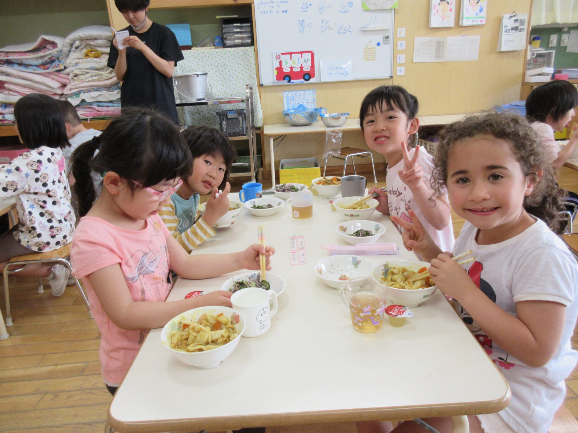 おまたせしました!今年はカレーうどん🍜もっちり麺と合います。「ずっと食べていられる!」といった子もいましたよ。