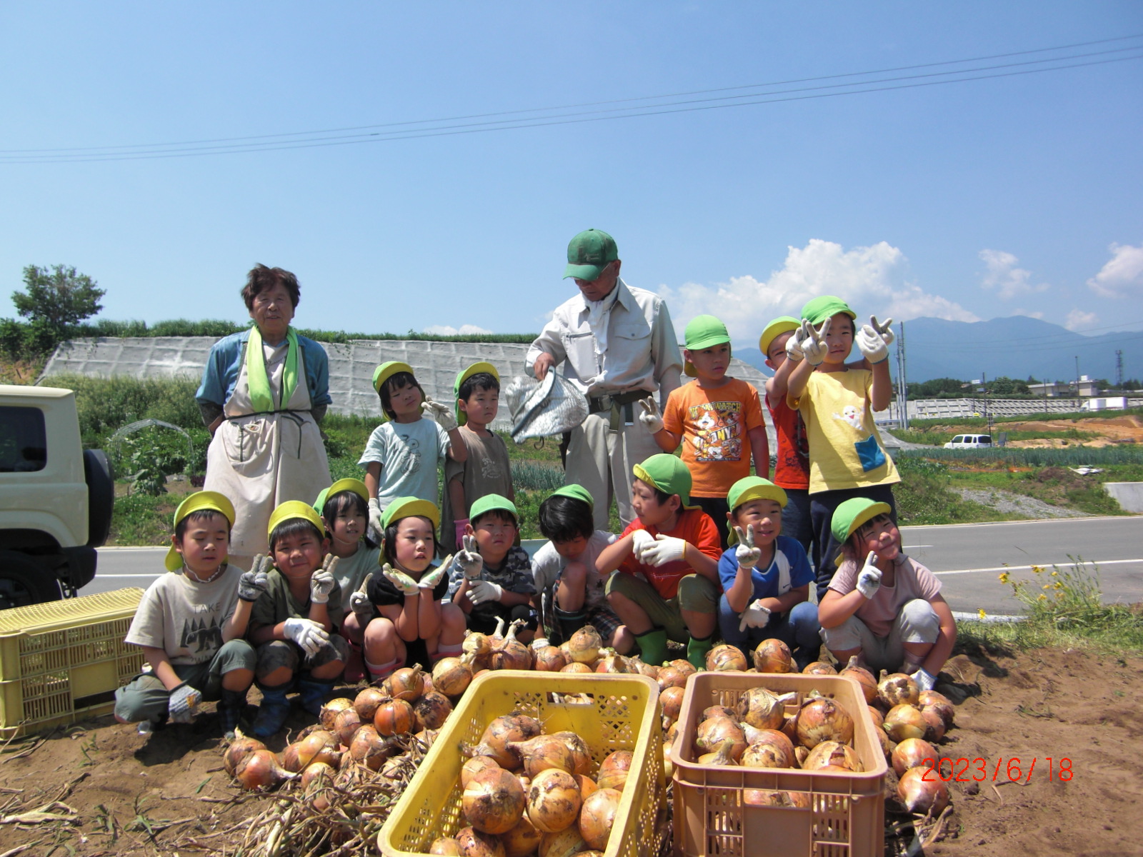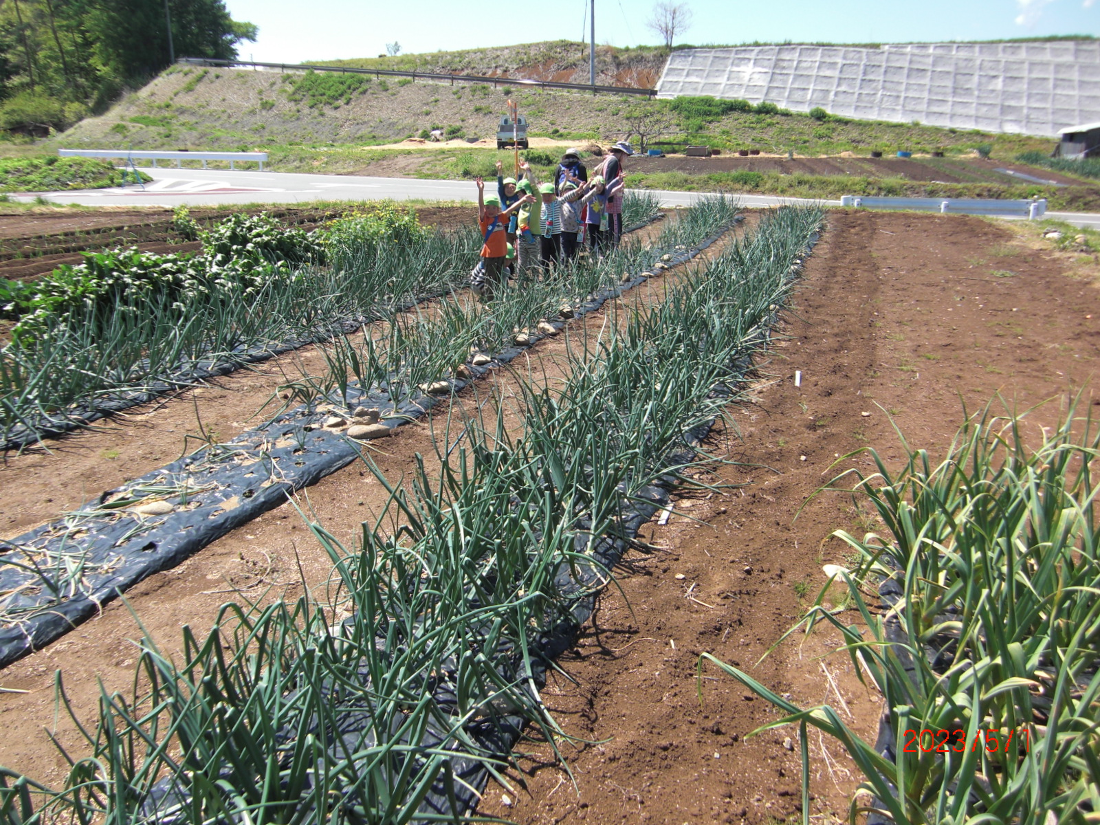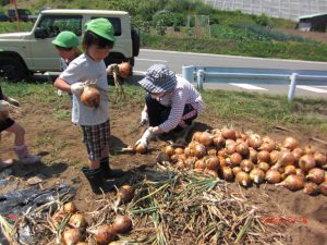 年長児は昨年度年中児のときに、この畑で野菜の会の方と一緒に玉ねぎ植えを経験させていただきました。