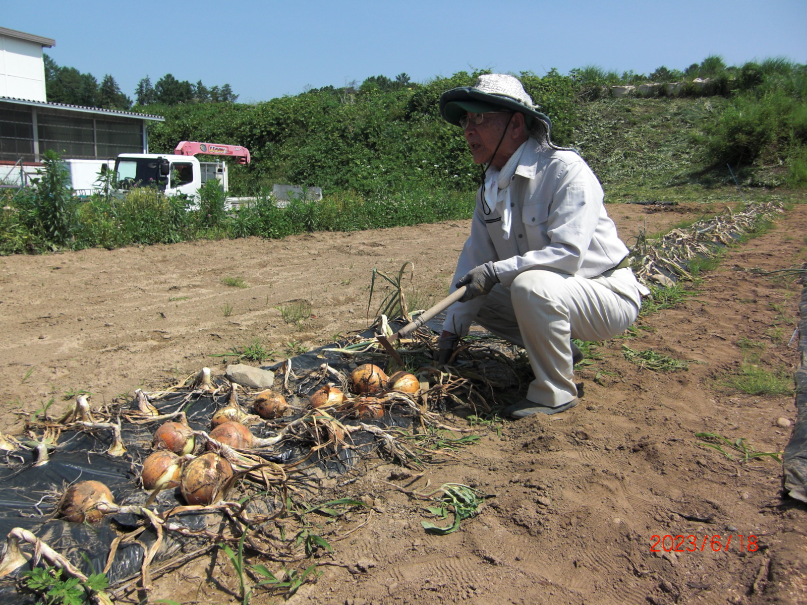 野菜の会のみなさんへ挨拶をして、玉ねぎ収穫の説明を野菜の会の方にしていただきました。