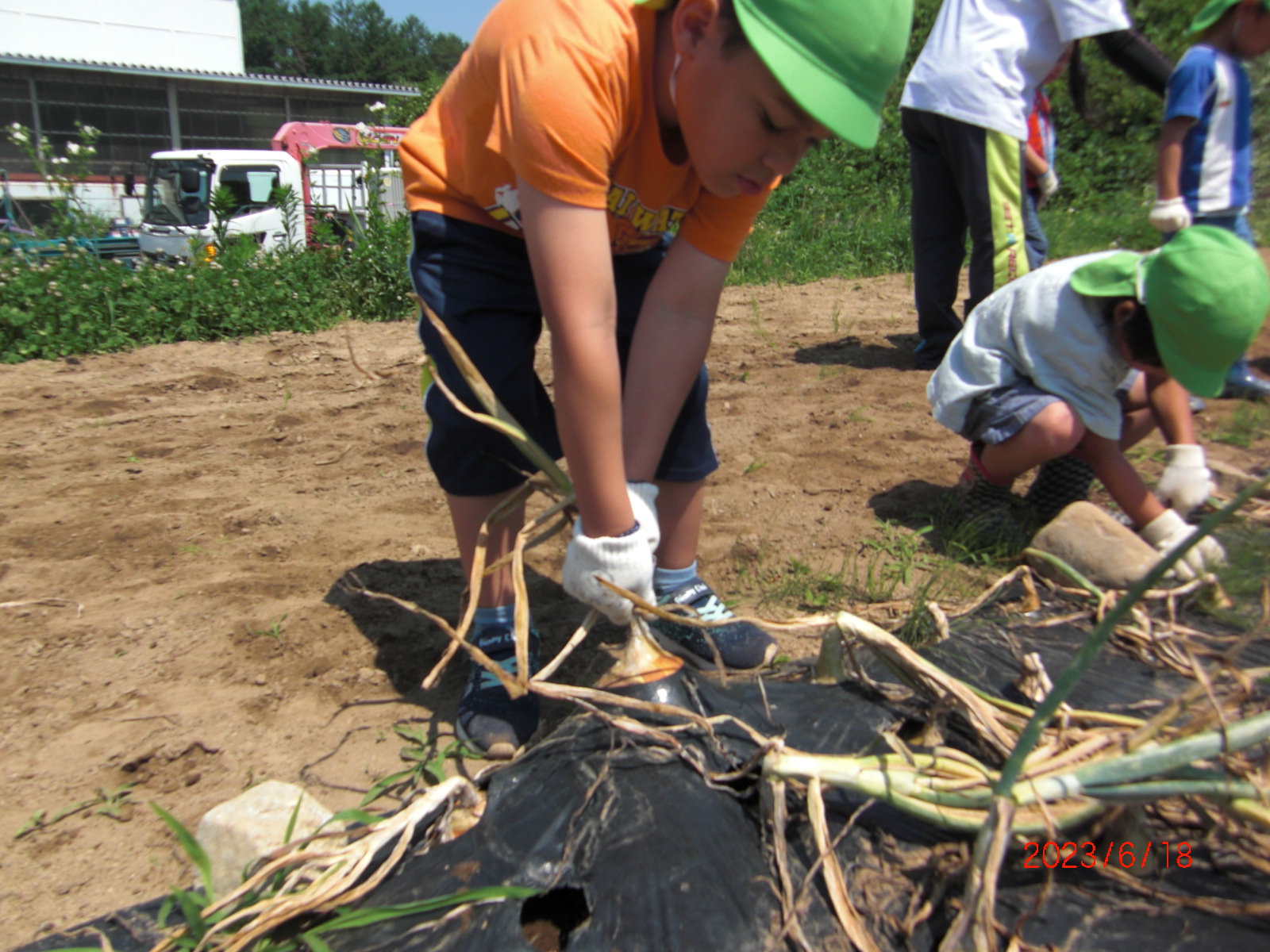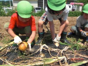 「根元を持って抜くんだよ」と教えてもらい、大きな玉ネギを頑張って抜きます!