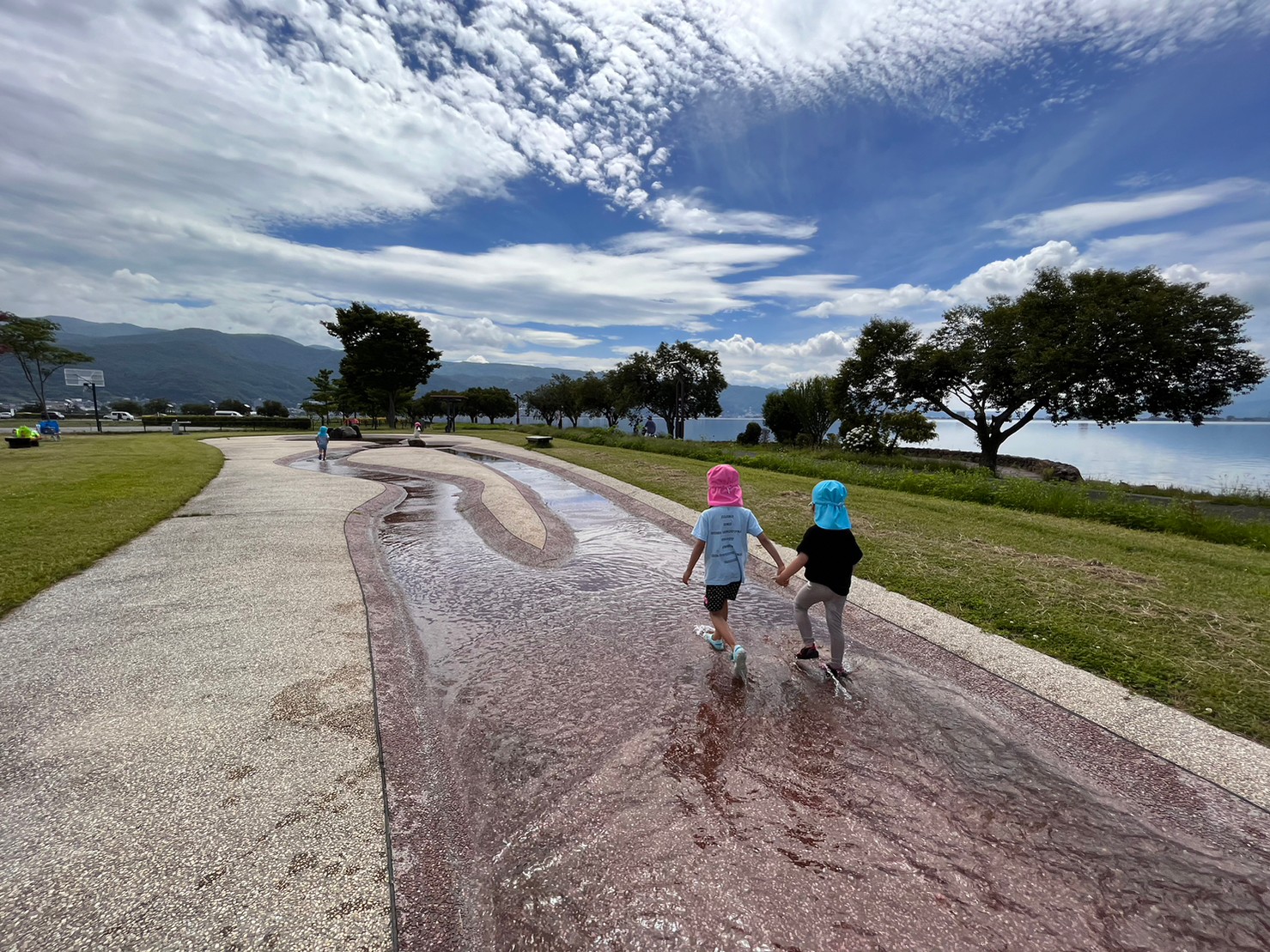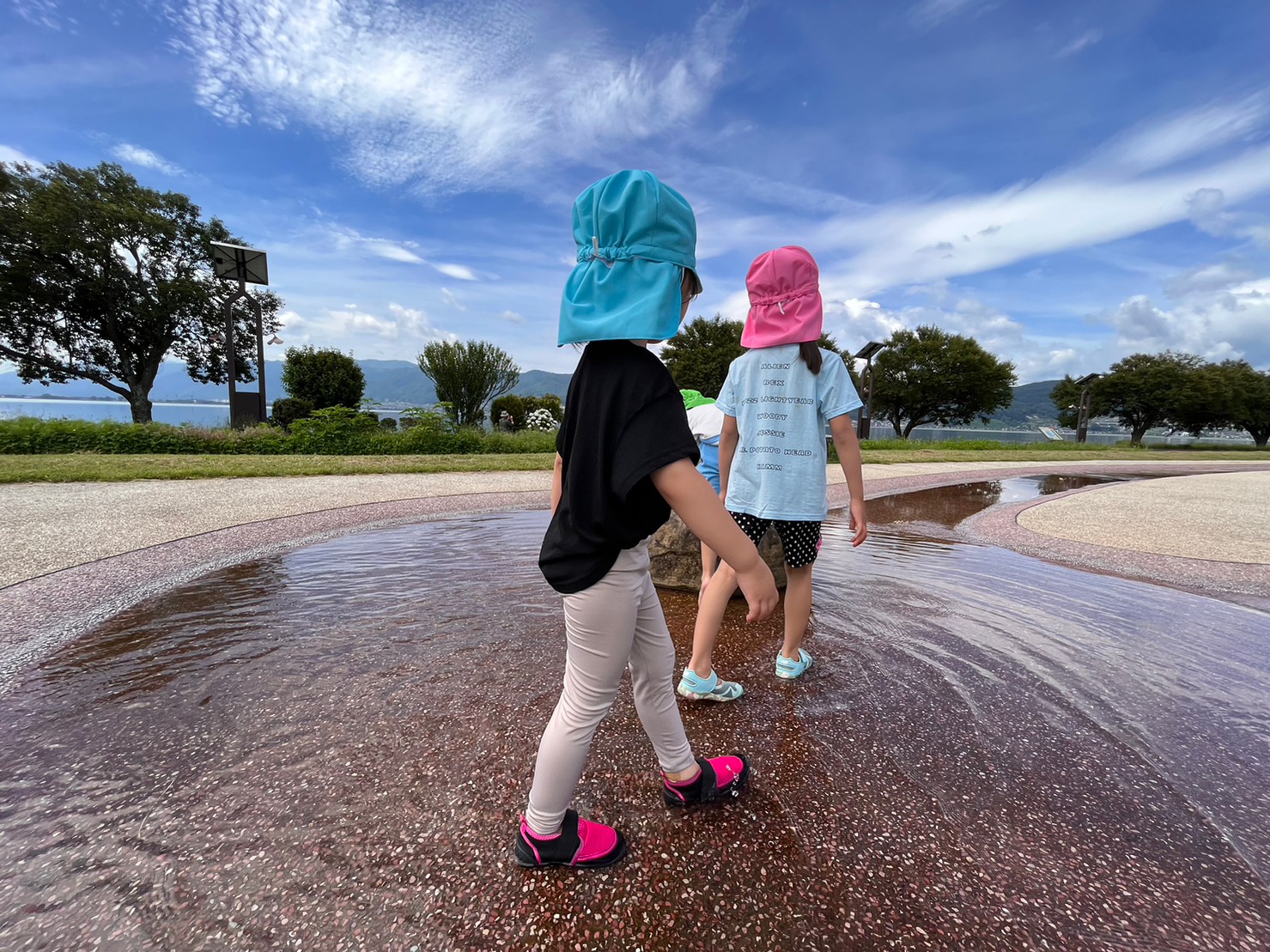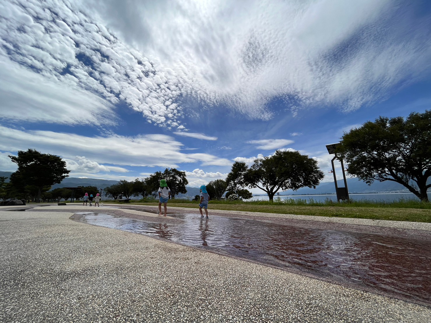 手を繋いでおさんぽしたり、水しぶきをあげながらお友達や先生と掛け合いをしたりと楽しそうな声があちこちから聞こえてきました(^^)