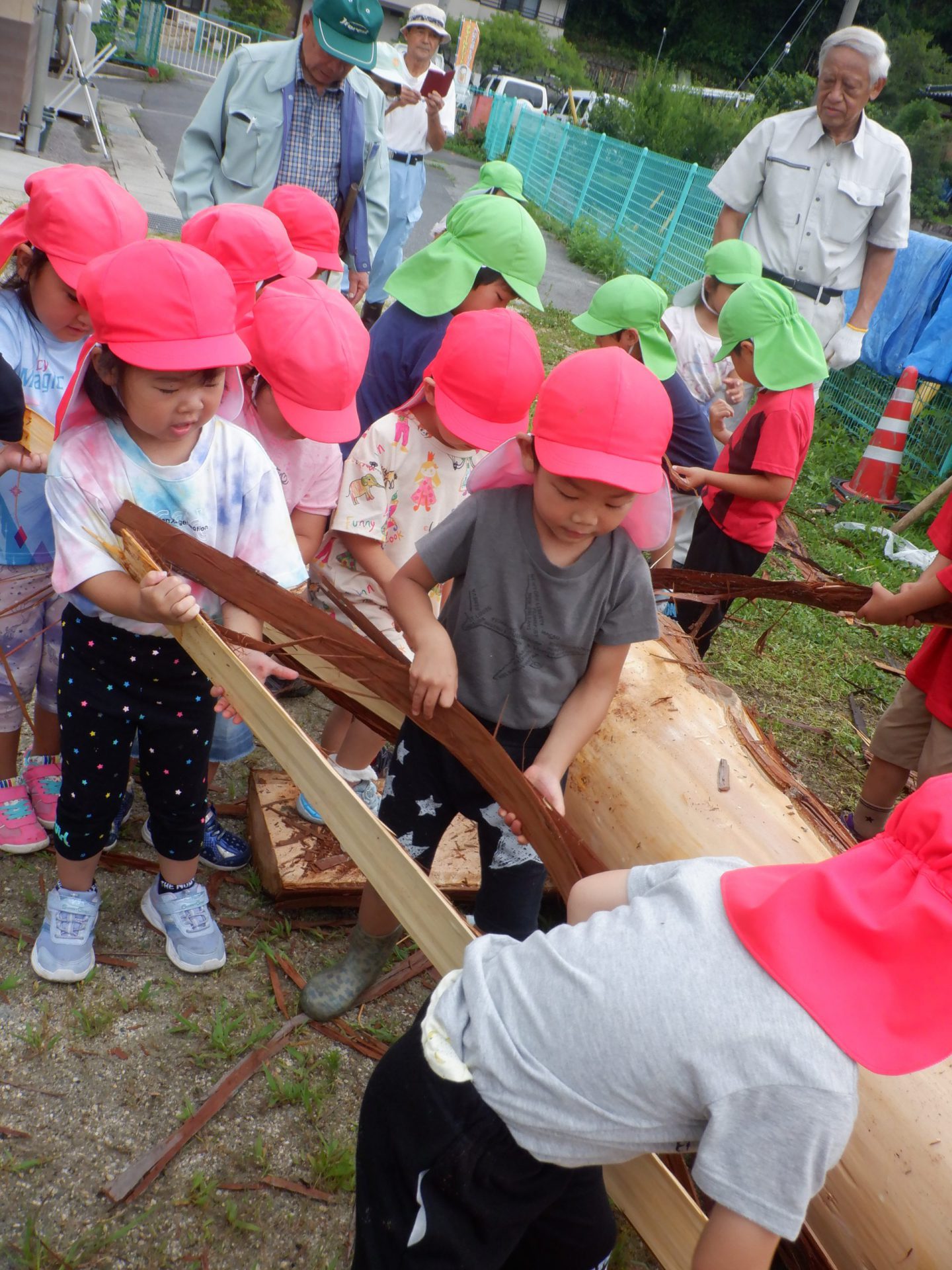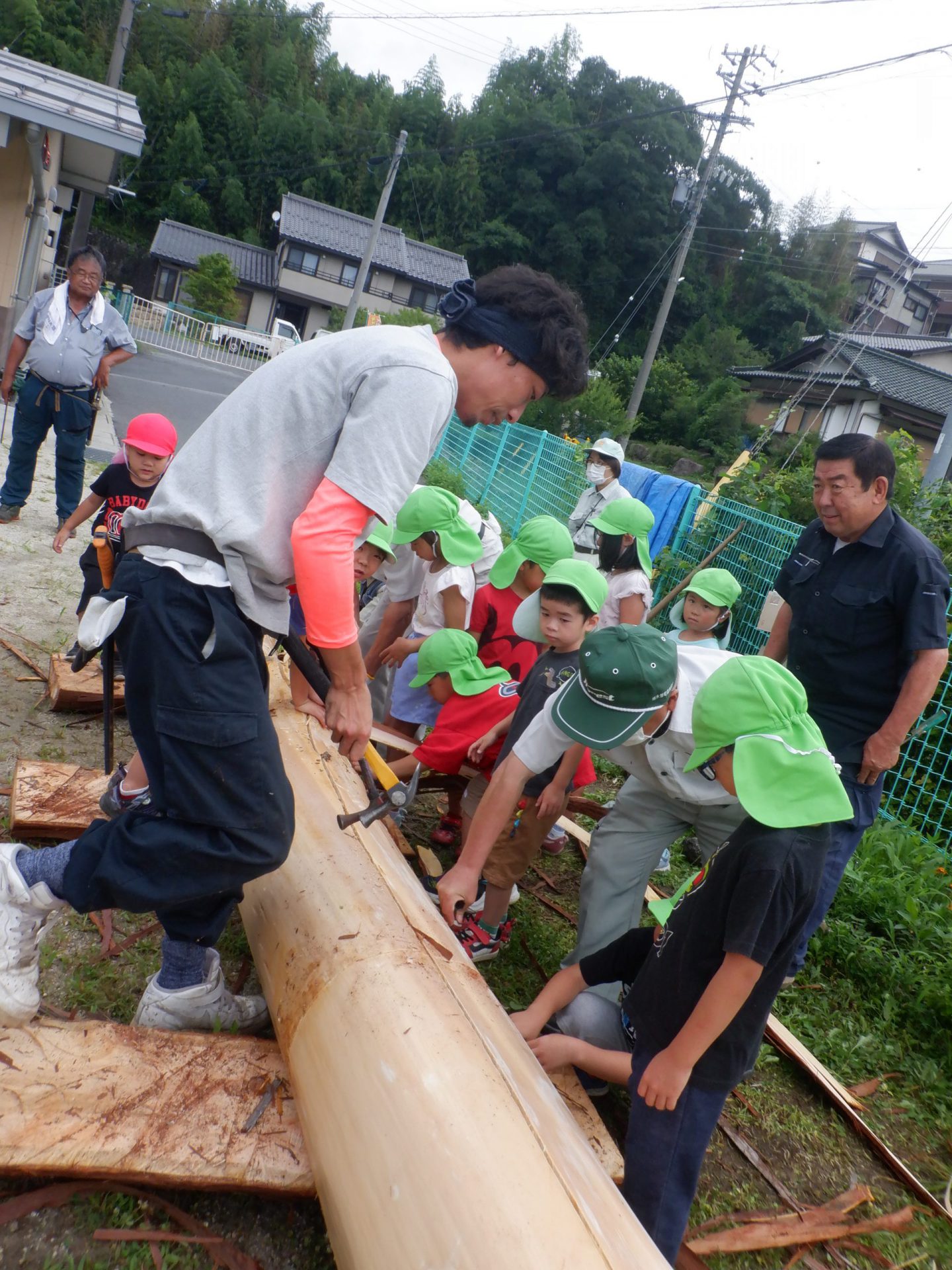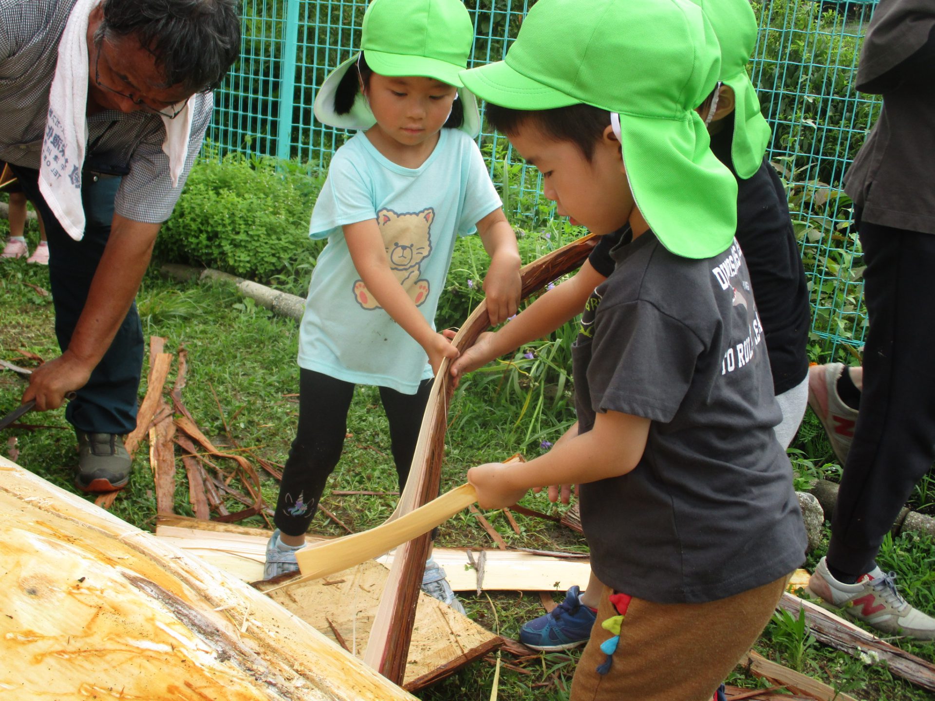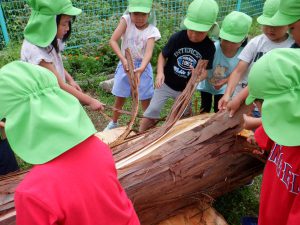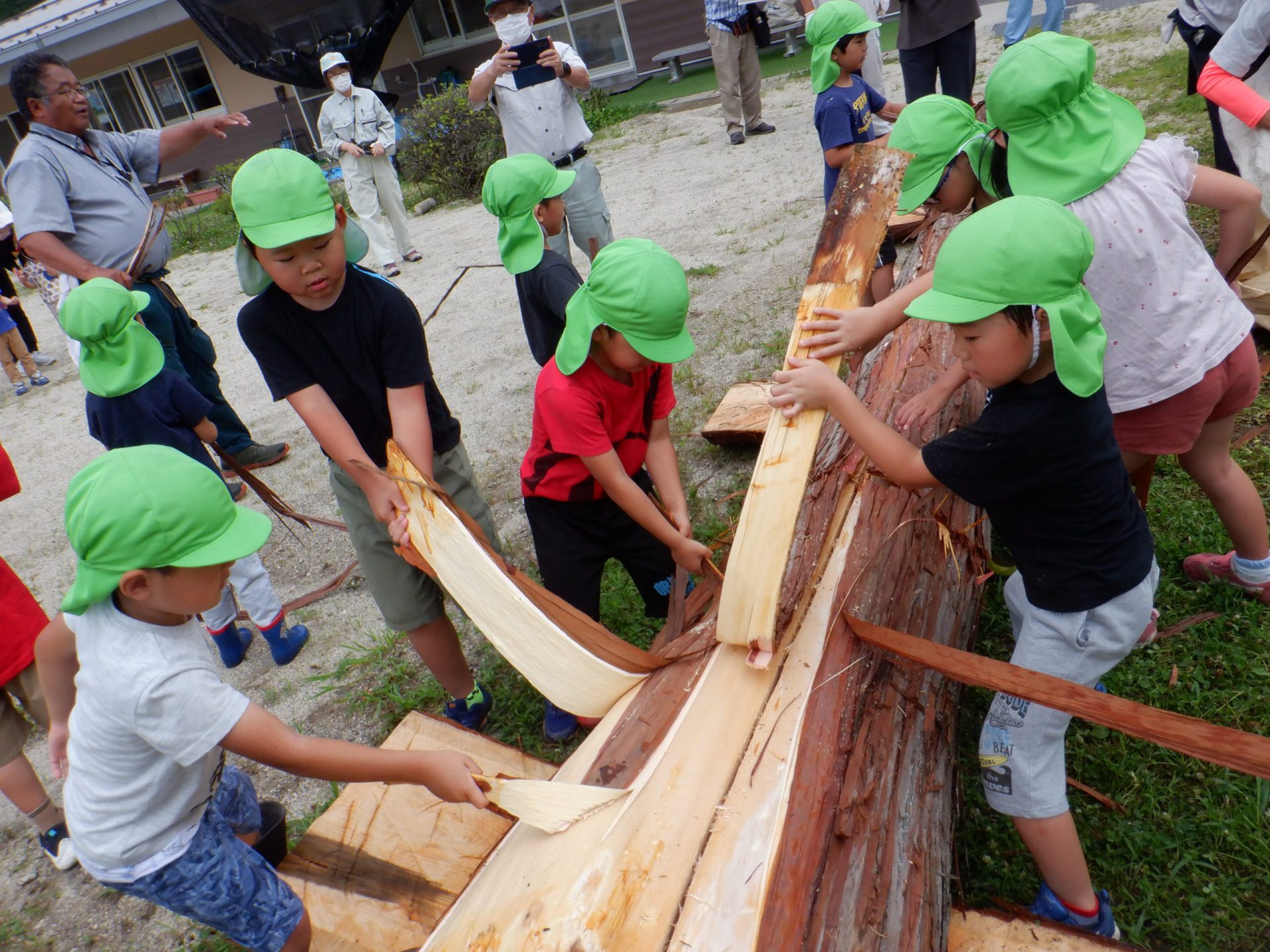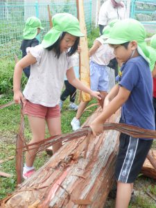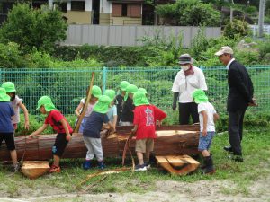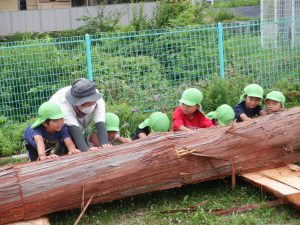 地域で木の仕事をしている方たちが来てくれて、子どもたちが皮むきをしやすいように準備をしてくれます。