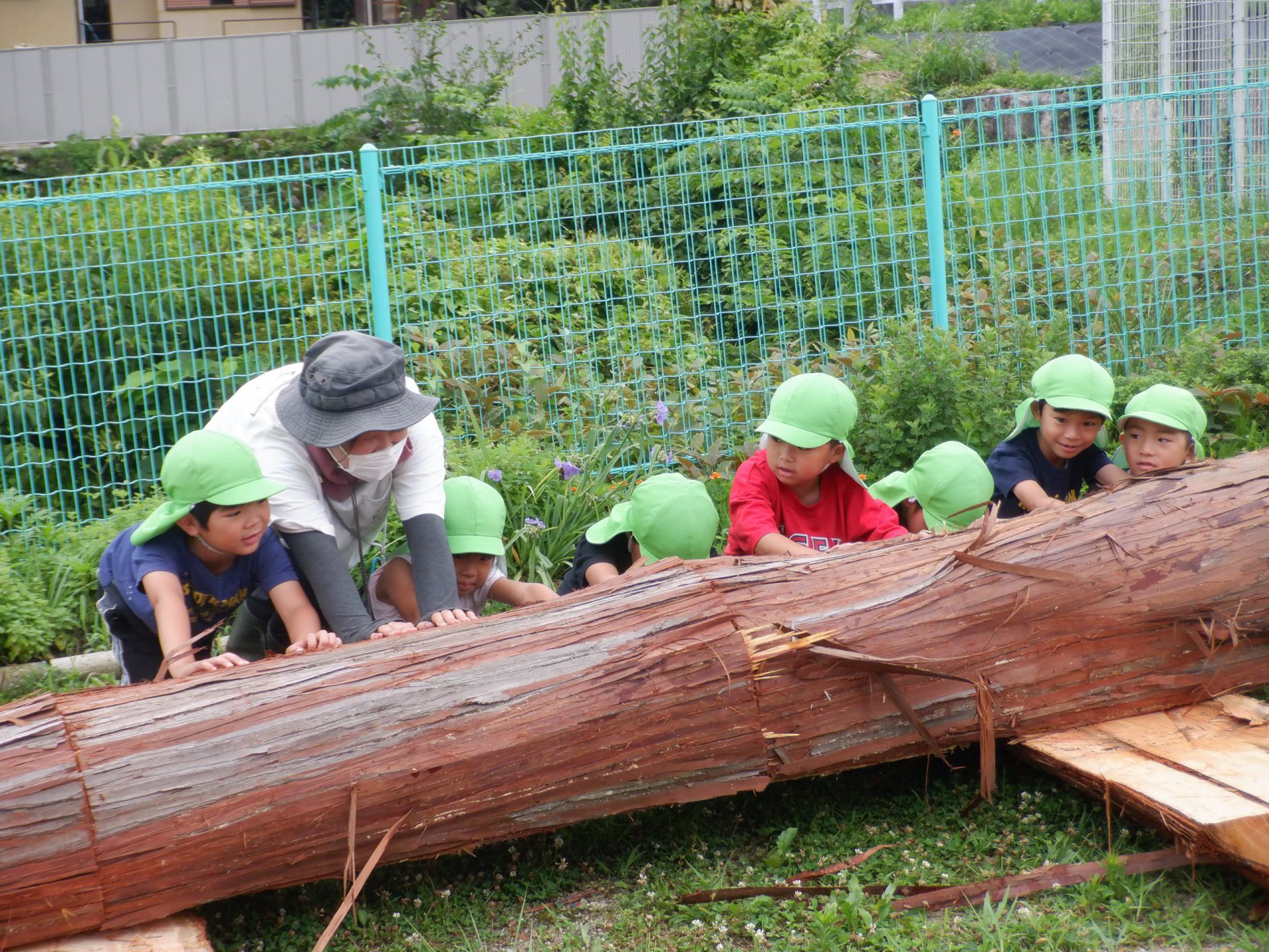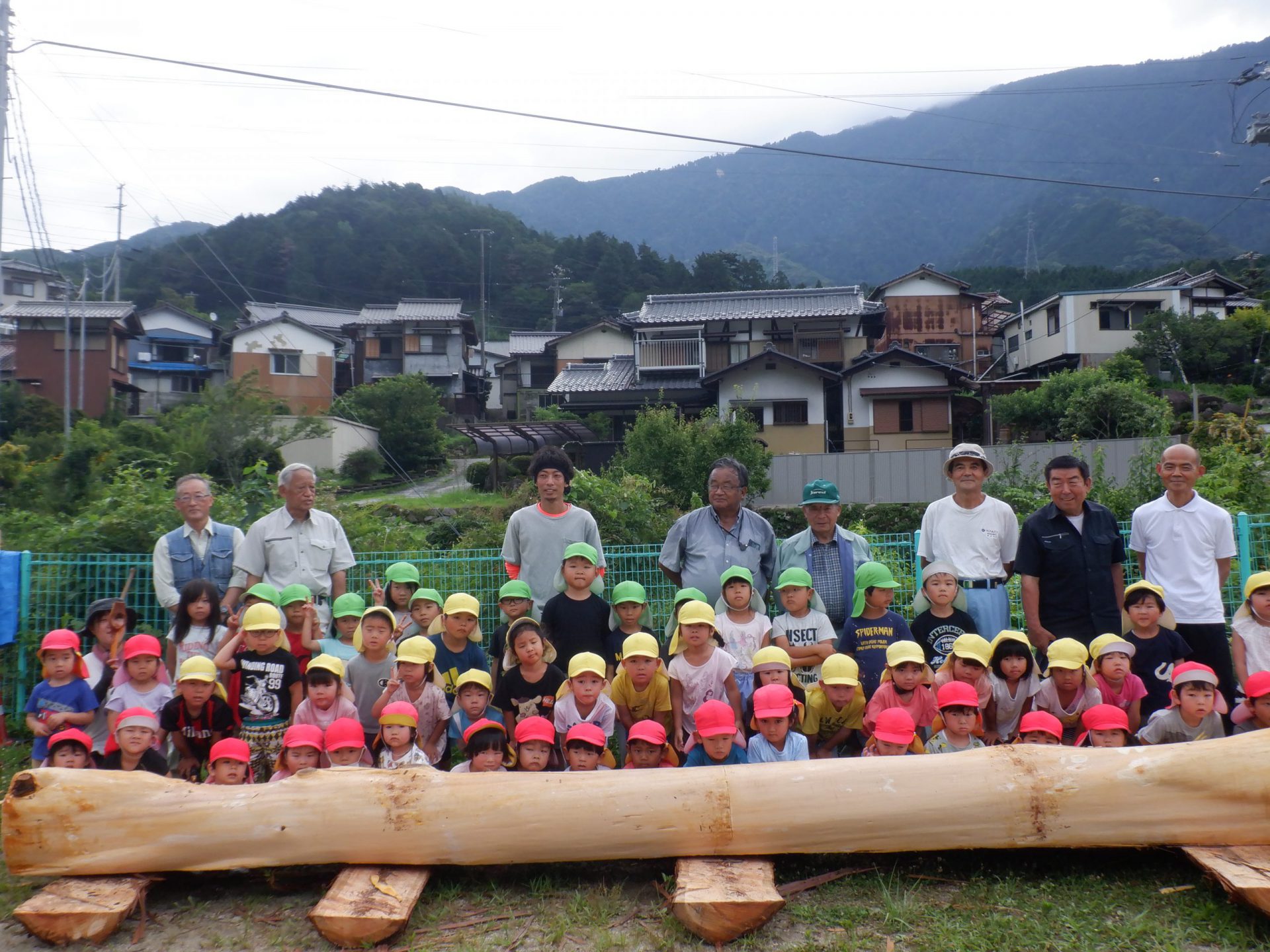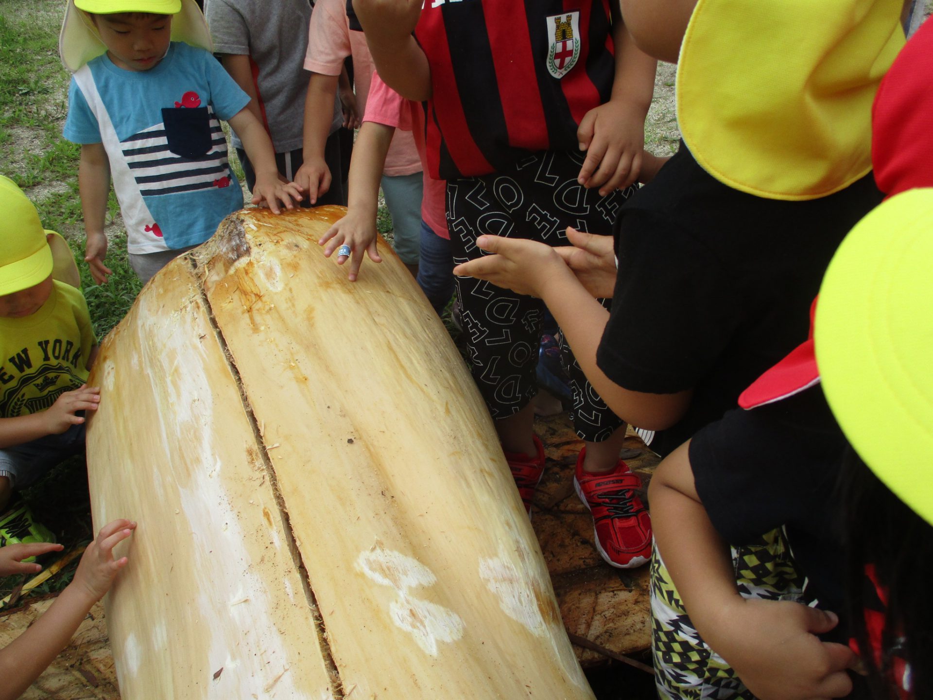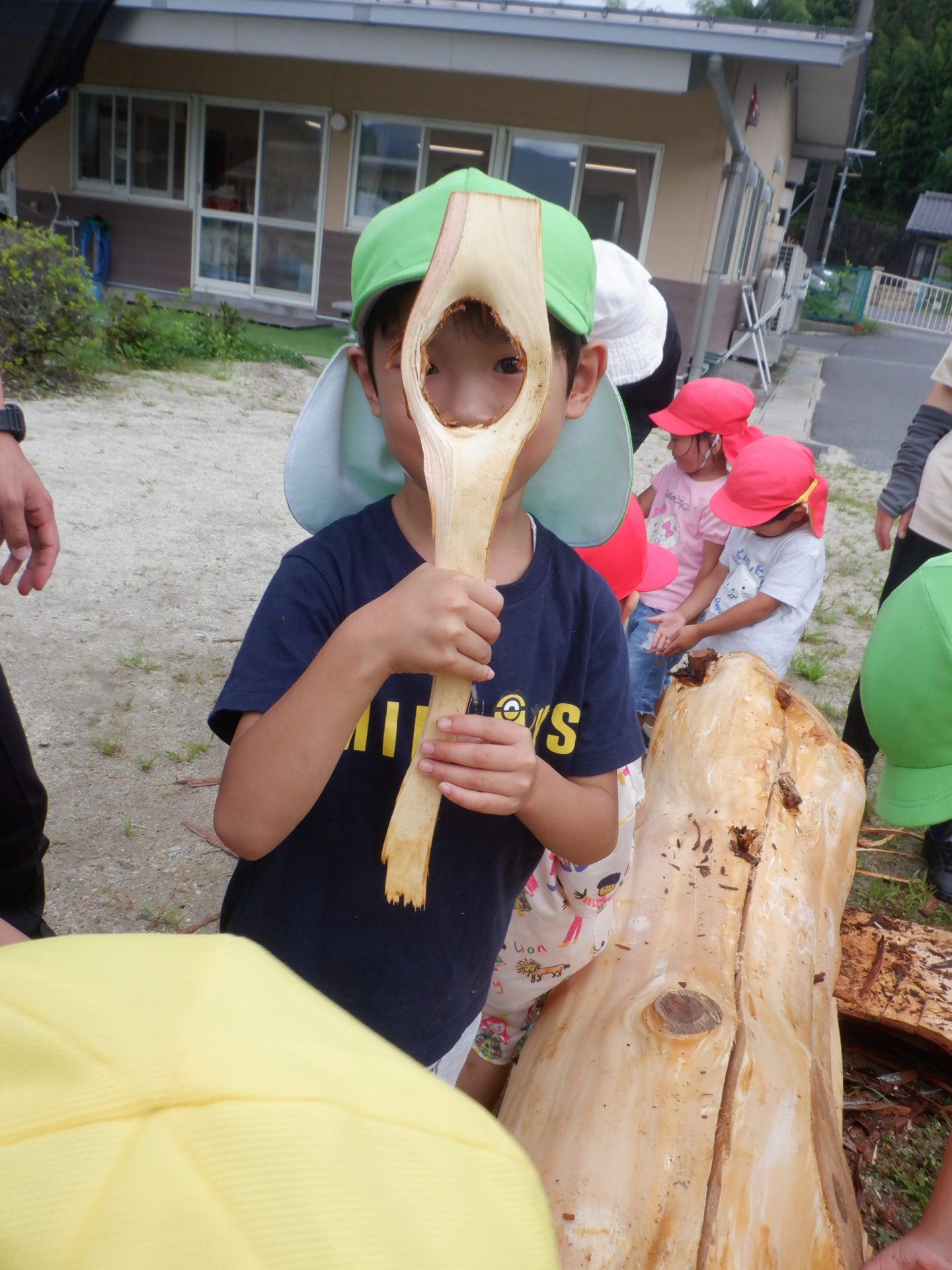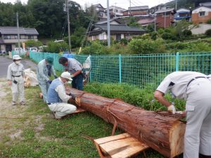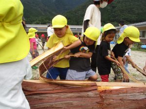 地域で木の仕事をしている方たちが来てくれて、子どもたちが皮むきをしやすいように準備をしてくれます。