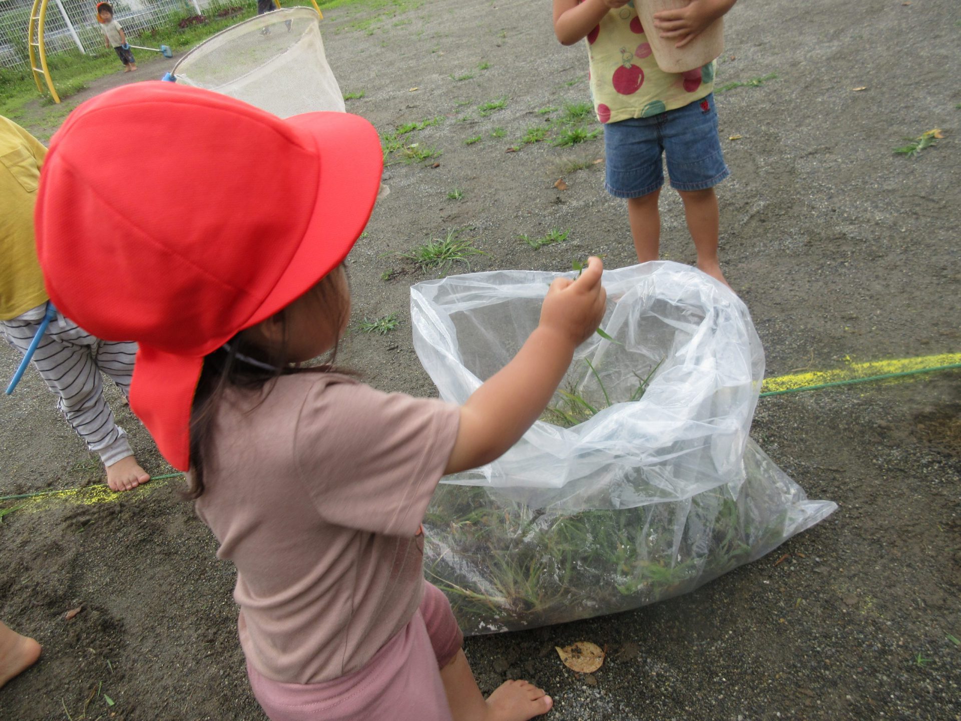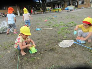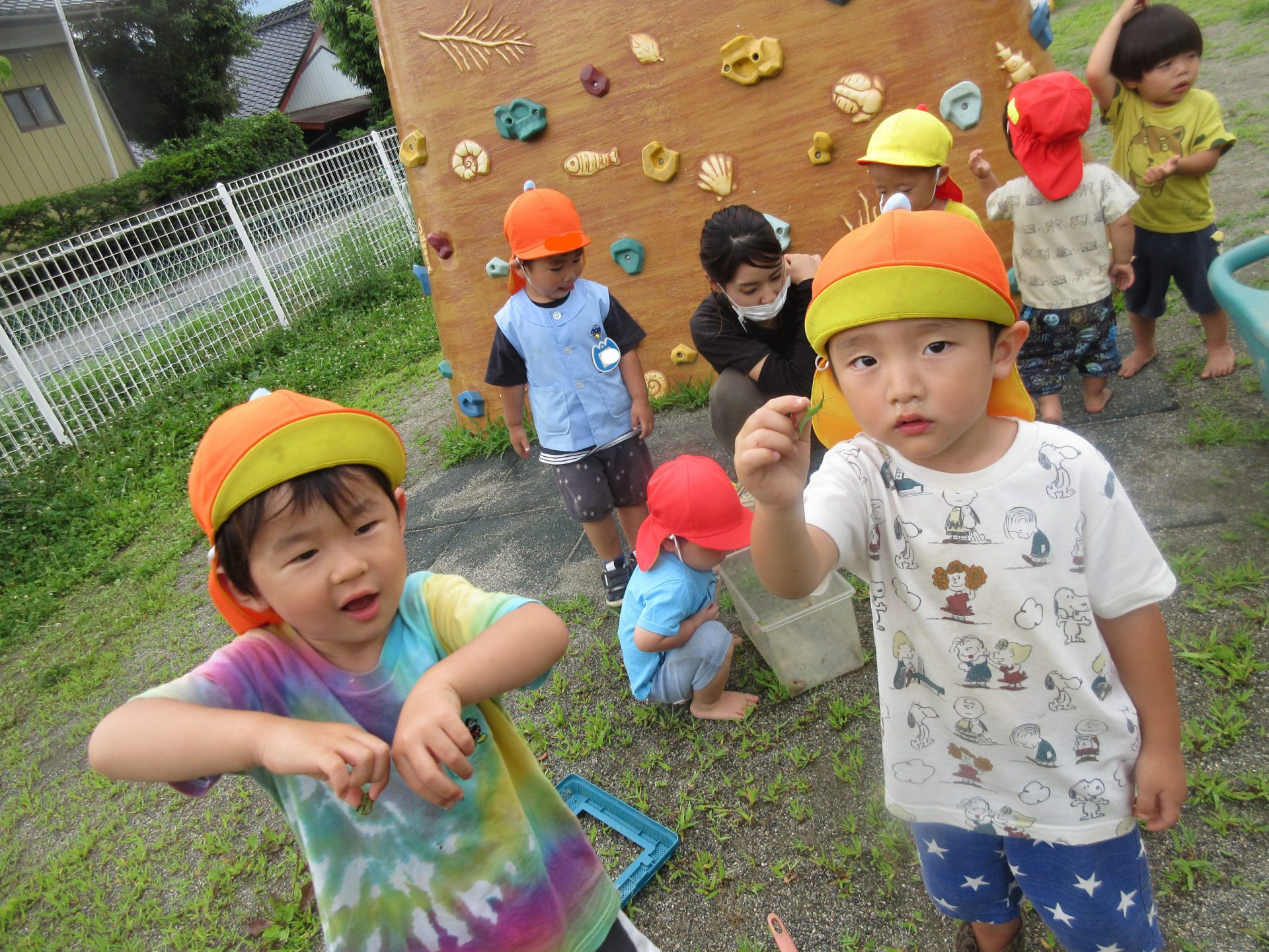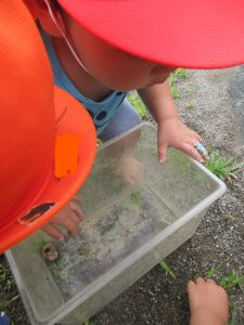 雨上がりは虫にたくさん出会えます 。かえるにかたつむりにバッタetc 年少さん達を中心にこちらも大盛況