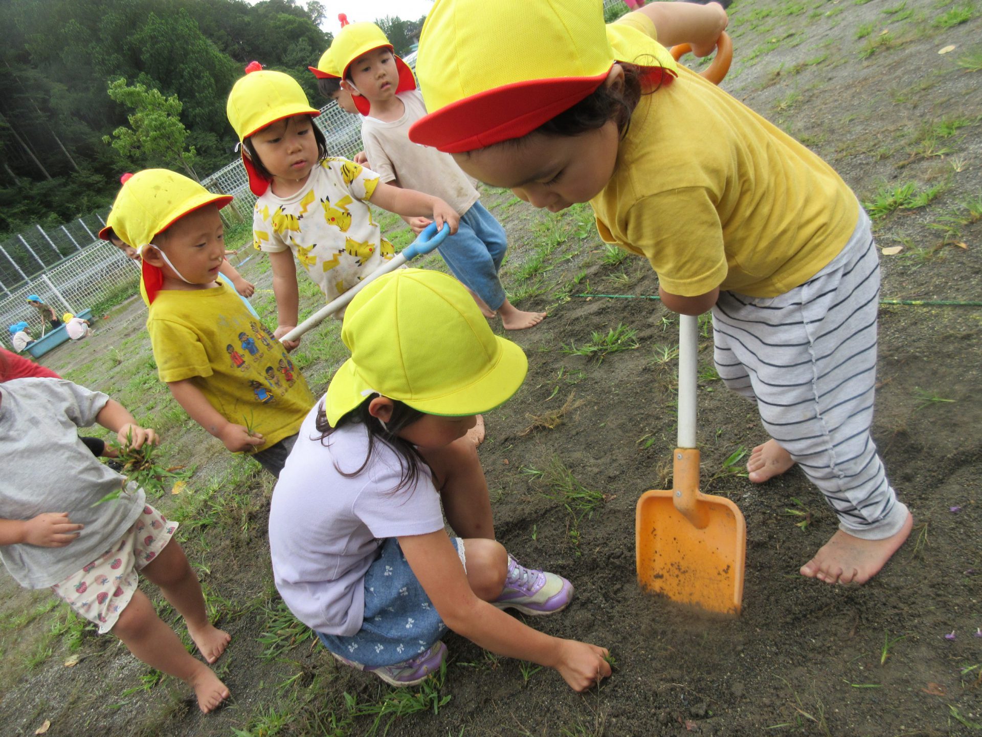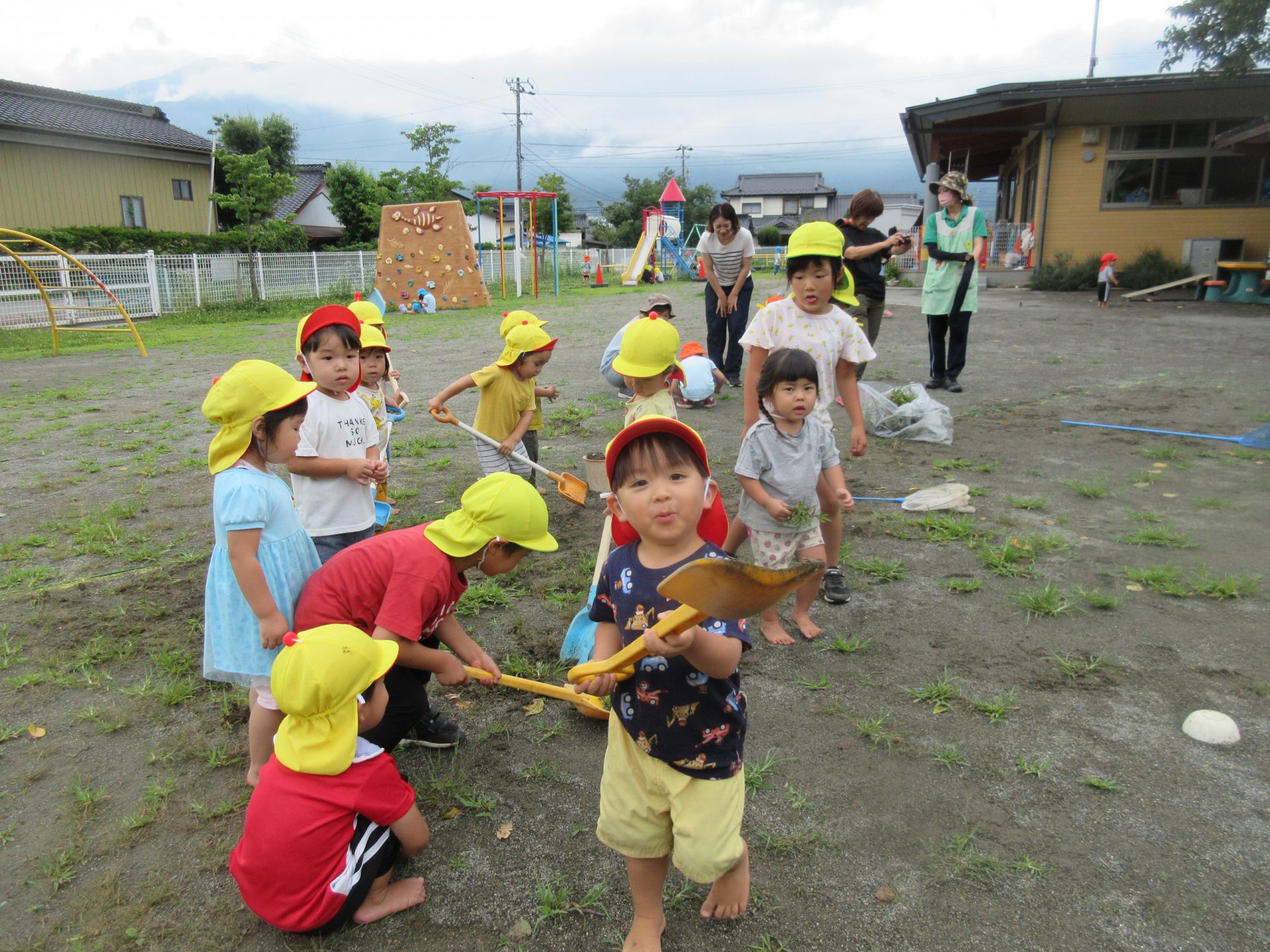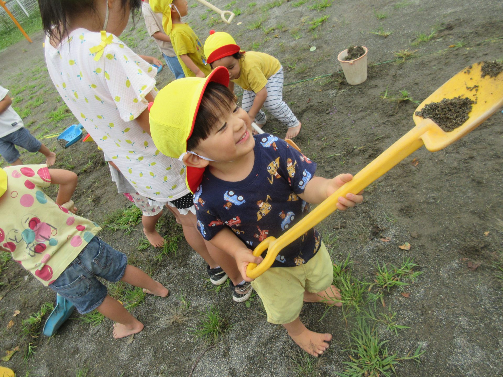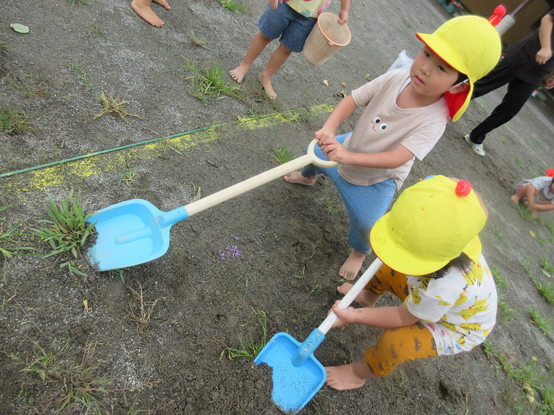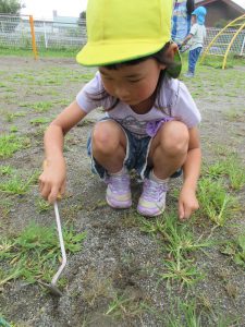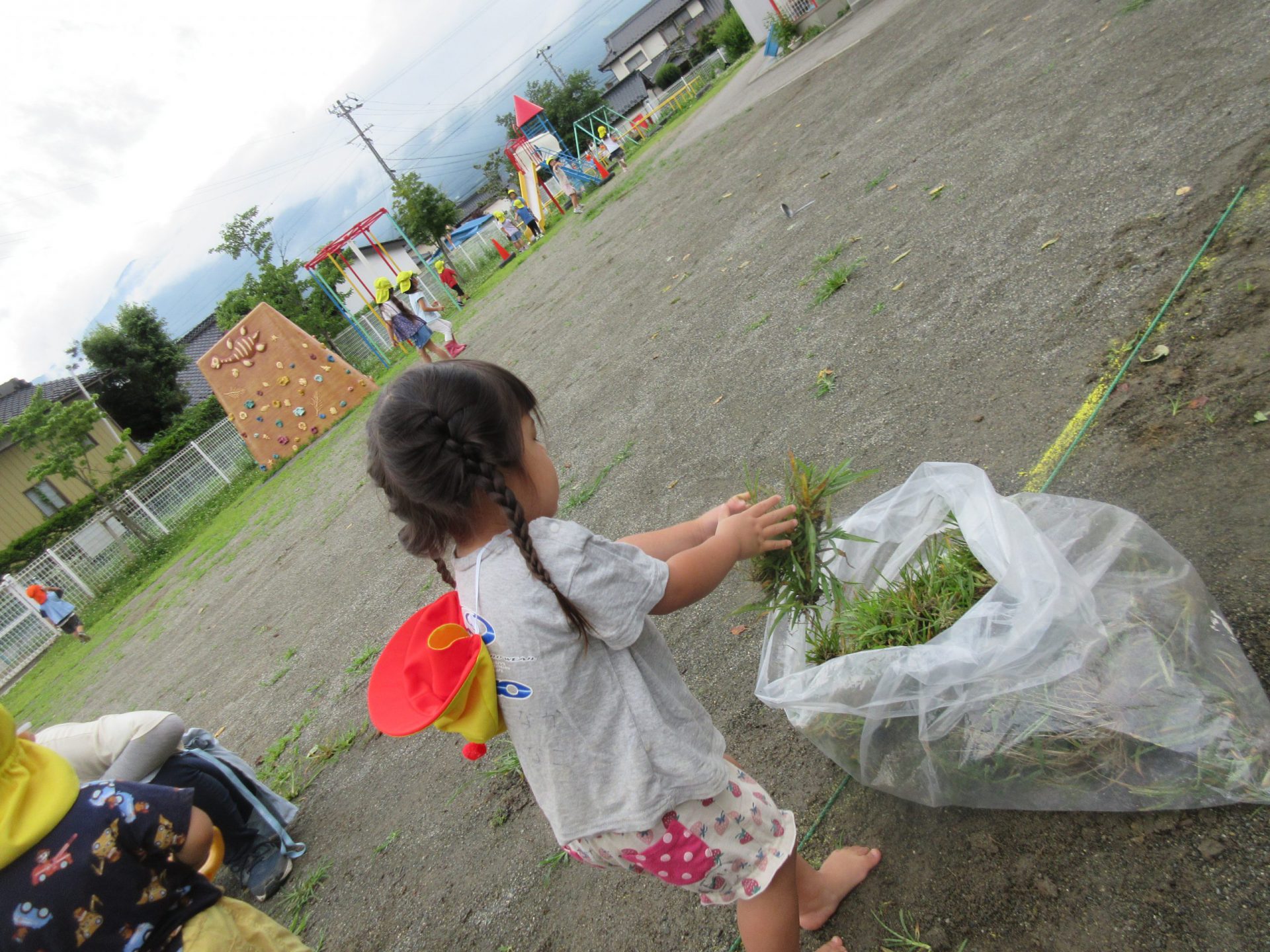 雨上がり、トラックの草取りをはじめると、2歳児さん達が「なにしてるの?」とよってきました。「草取りしてるの」というと、「やるやる!!」と大好きなお手伝いが始まりました。
