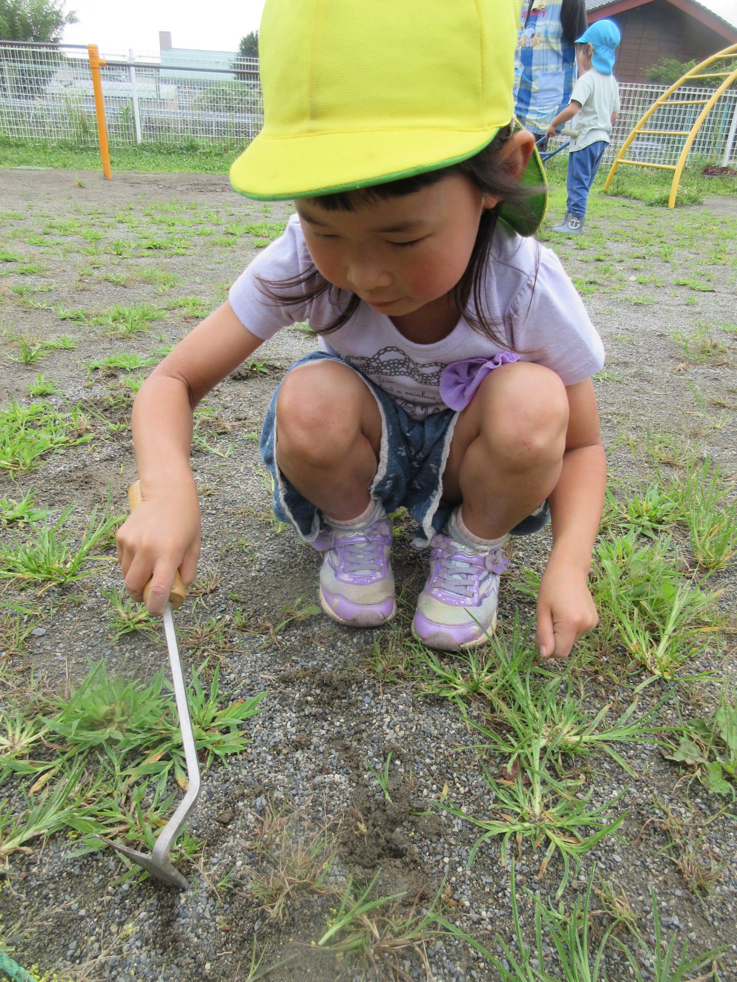 その中に、年長さんのKちゃんがせっせと草取りをしていました。子ども用のシャベルでは思うように抜けません。「本物の道具 使ってみる?」というと「うん」と。せっせと固い草をとります。 がんばったので、手に豆ができて、つぶれてしましました。「痛かったね。ほんとうにありがとう」と言いながらバンソコウをはりました。それを見た友だちから「どうしたの?」ときかれたKちゃん。 「あのね。シャベル(子ども用)じゃなくて本当ので草取ったんだよ!!」と誇らしげに話す姿。素敵だなあ。