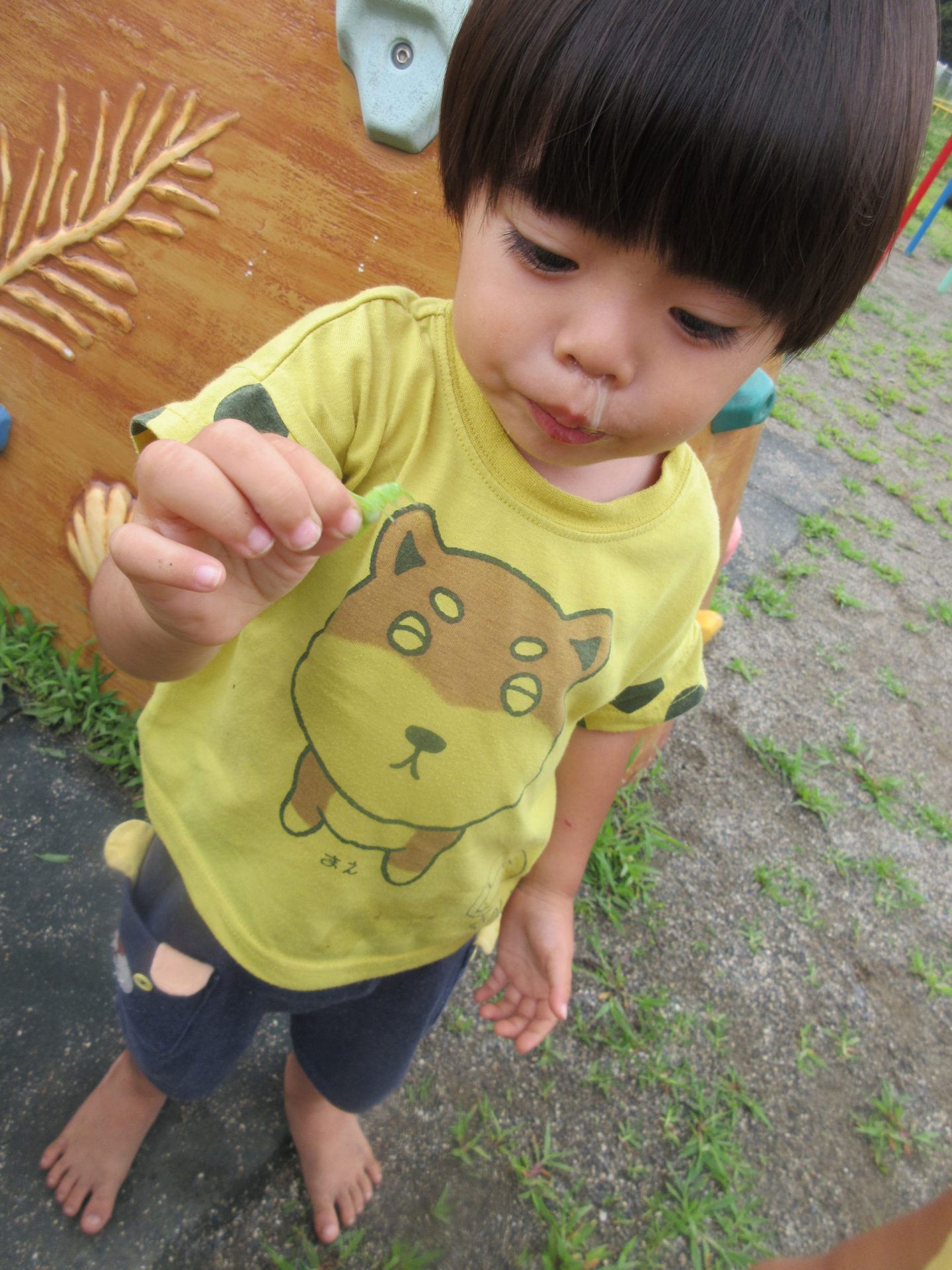 涼しい顔で小さなバッタを捕まえたT君 得意そうに見せてくれました。上手に つかんでいるのです。これならバッタも痛くないかな。子ども達と一緒に過ごしてくださいね。